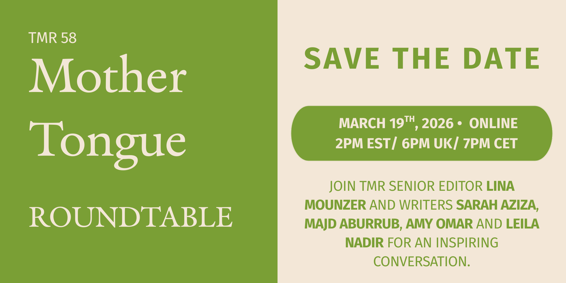 Join us for an unscripted, deep-dive roundtable as we pull back the curtain on our latest issue, Mother Tongue. Hosted by TMR Senior Editor, Lina Mounzer, and special guests.