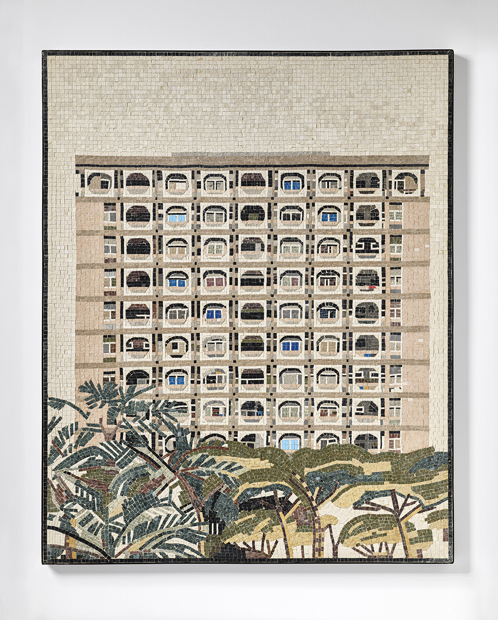 Younis lived in Abu Dhabi for over a decade, and during that time she began to hear the cracking sound that buildings make in the city, especially at the end of the day, when temperatures are changing and heavy materials began shrinking or expanding, trying to settle back into their natural states after a long day of weathering the intense heat. Climate Conditions is a series of mosaic panels of real buildings in Abu Dhabi, using calcareous materials similar to those of the iconic and largely demolished buildings from the city, in which the tesserae, or mosaic pieces, stand for those cracking sounds, and reminds us of the inescapable relationship between architecture and the environment, at a time when stress heat is one of the most pressing issues in a region that demands extraordinary consumption of natural resources to make human habitation and state-making possible.