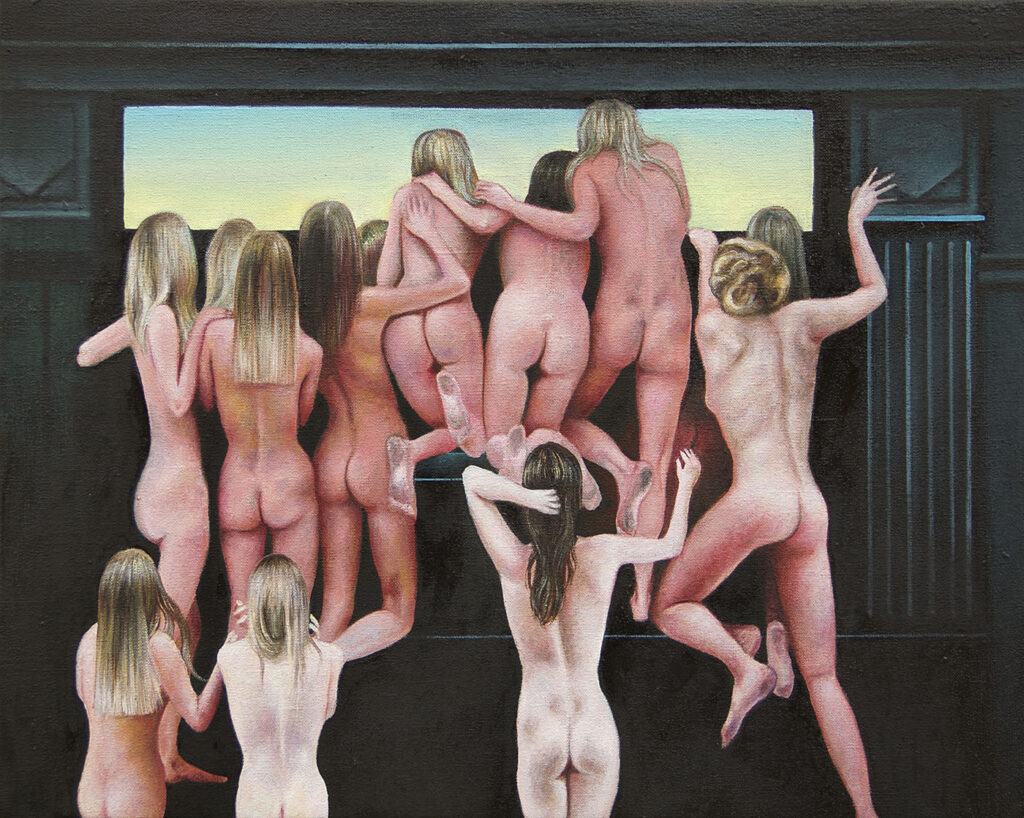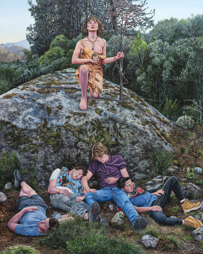 Born in Iran in 1981, the artist came to France when she was 18, fleeing oppression in Iran. She received a French grant to study art and got into the Beaux-Arts in Paris in 2000. At the time, she found an anti-figurative atmosphere, but remained “fascinated by pictorial power.” She began working with collages and then seguéd into painting hyperreal imagery. Nazanin Pouyandeh takes photographs of her friends and then paints onto large canvases (“I can’t have them standing around posing for days”). She recently described herself as a multilayered person with a complex identity. “I am a patchwork of several cultures; we all are…The notion of collage is also philosophical. We are all more or less créolisés these days.”
