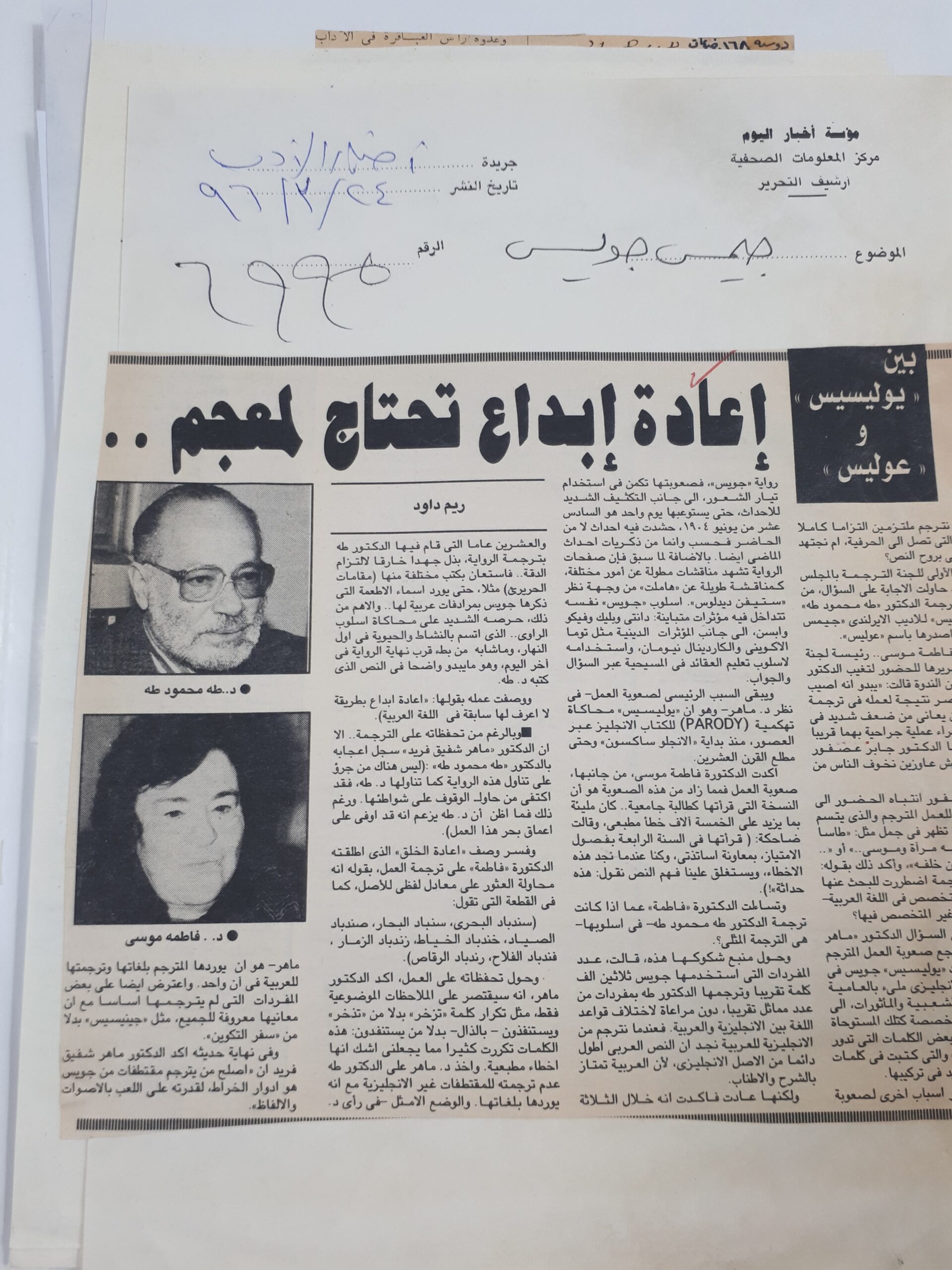 كل هذا الاستطراد الطويل لأصل إلى تغطية صحفية نُشرت في «أخبار الأدب» بتاريخ 24 مارس 1996 لندوة عقدت في «المجلس الأعلى للثقافة»، جاء التقرير تحت عنوان: «بين عوليس ويوليسيس: إعادة إبداع تحتاج لمعجم»، وبدأت ريم داود صاحبة التقرير كتابتها بسؤال: «هل نترجم ملتزمين التزامًا كاملًا وتامًّا بالدقة التي تصل إلى الحرفية، أو نجتهد ونؤكد ما يسمى بروح النص؟»