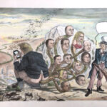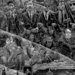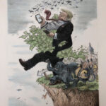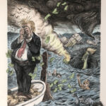 We previously had the privilege of working with artist Sandow Birk in 2015, when he exhibited a series of works at the Koplin Del Rio Gallery (then located in Culver City, California) that would be published the following year as American Qur’an—a beautiful coffee table book that remains an incredible conversation piece. Birk went on to create a series of both black and white and color lithographs he calls Trumpagruel. The color images in this series are pencil on mylar drawings, done while the artist was in residence at the Ballinglen Arts Foundation in Ireland, and they are available from his San Francisco representatives at the Catharine Clark Gallery. A black & white Trumpagruel series are are stone lithographs, done and published by Auckland Print Studio, New Zealand, and represented by the Koplin Del Rio Gallery in Seattle.