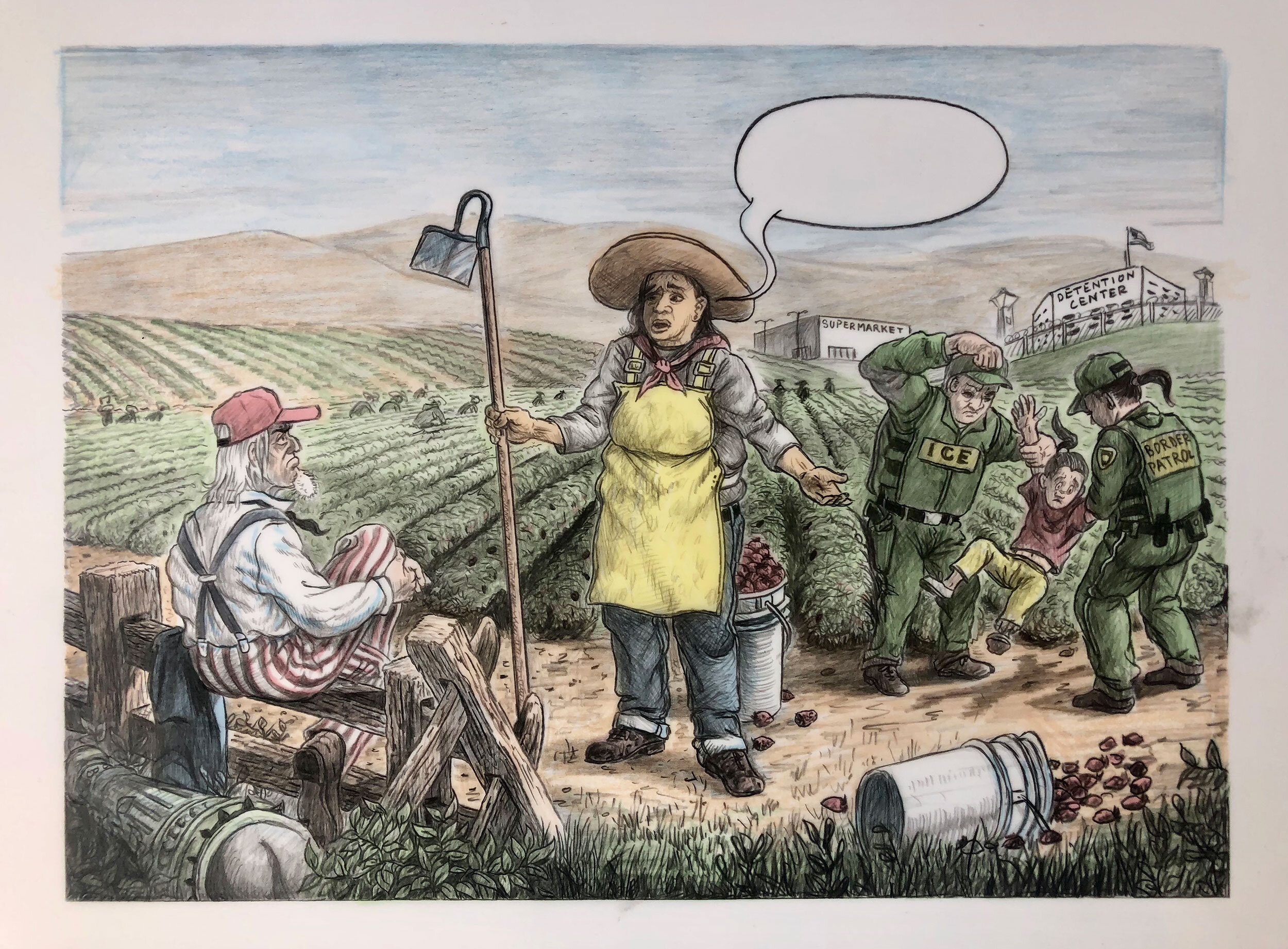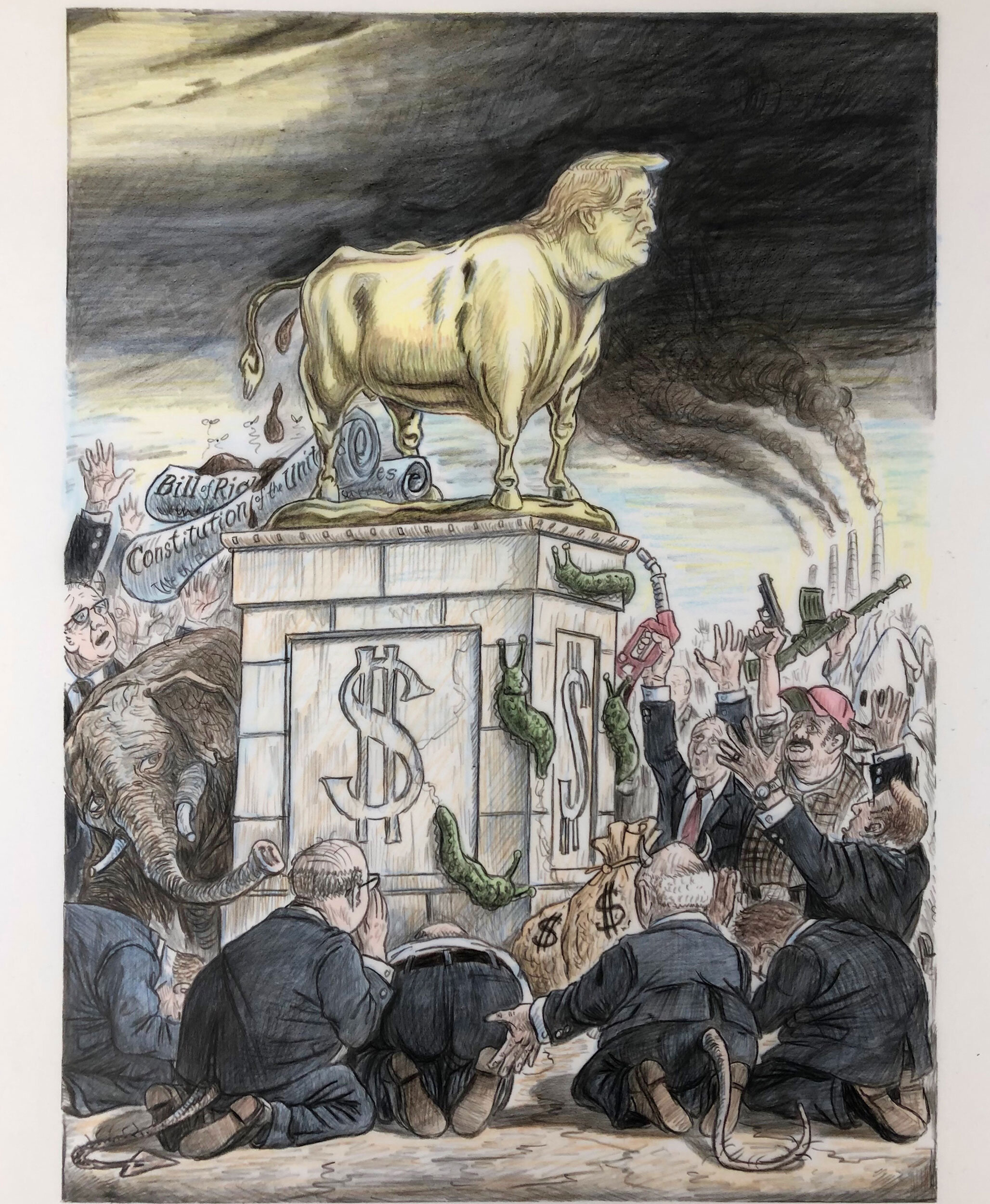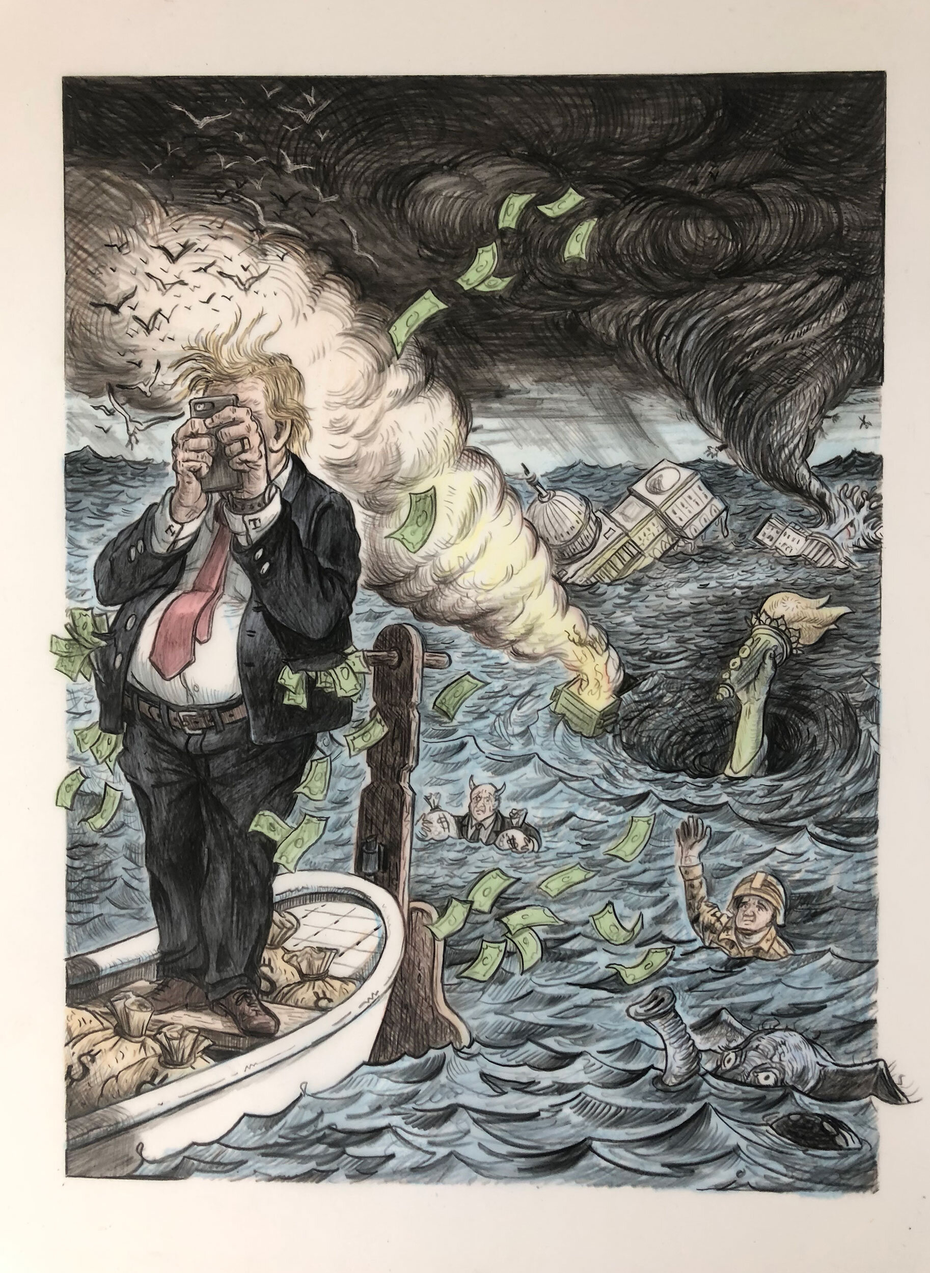 “The inspiration came from an old copy of The Adventures of Gargantua and Pantagruel” that I had found in a local used bookshop here in Los Angeles more than 15 years ago. I bought it because it is full of the illustrations—more than 200 I’d guess—by Gustave Doré. The line work and the looseness of them is really amazing, and the use of lights and darks is also really strong in his compositions. While I had only read bit of the huge volume of the tales of Gargantua, the general idea that there are two big baby giants traipsing around the country and laying wreck to everything due to their bumblings and ineptitudes seemed like a perfect parallel to our ‘president’.”