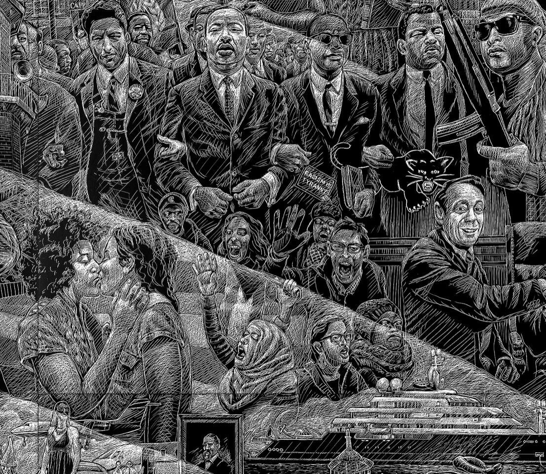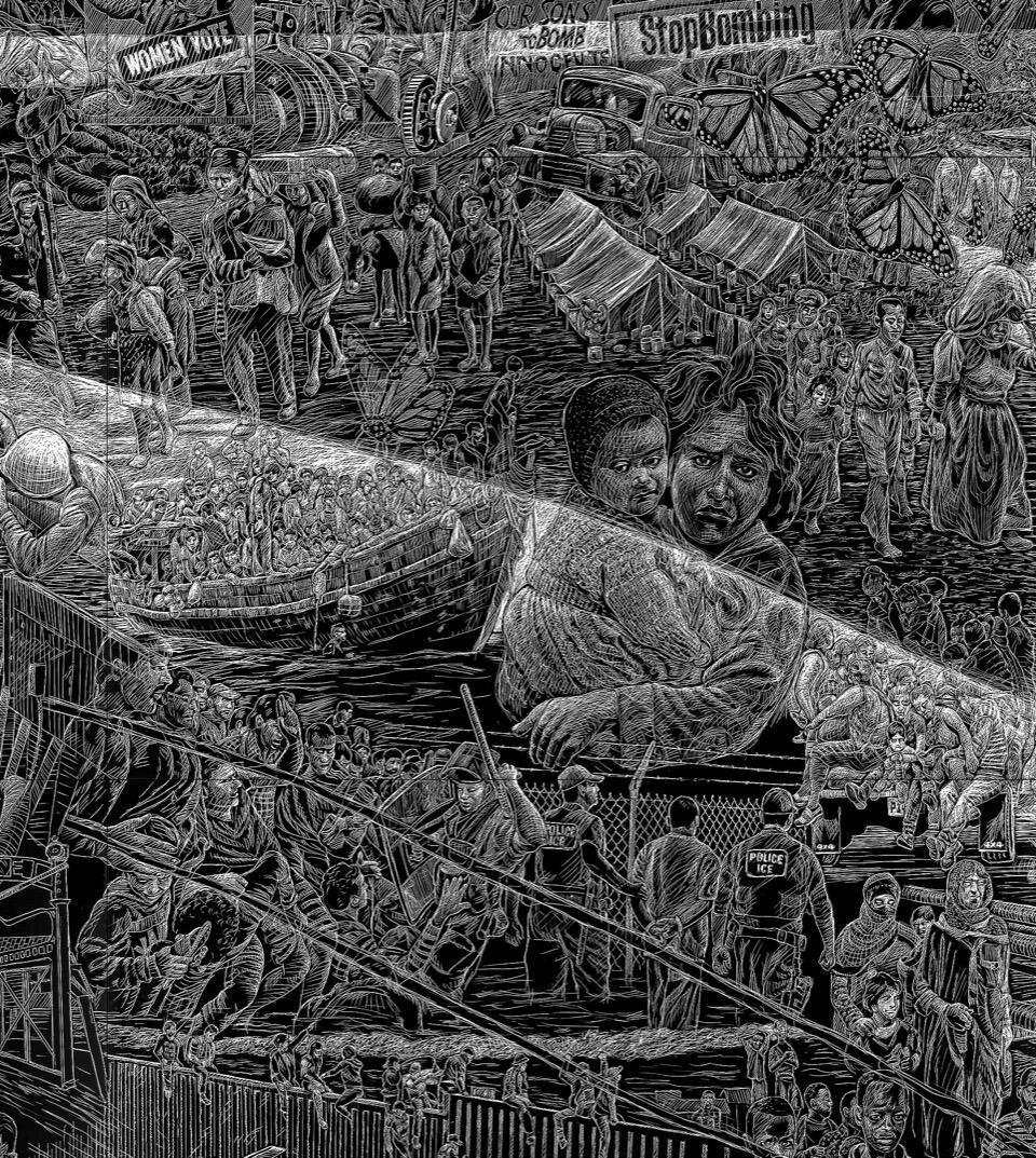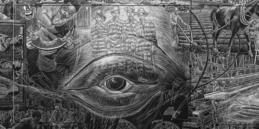 These images are taken from The Whale. For eight months artist Jos Sances was able to focus joyfully and manically on this very large scratchboard drawing that was inspired by Moby Dick and the history of whaling in America. The whale’s skin is embedded with a history of capitalism in America—images of human and environmental exploitation and destruction since 1850. The whale is a metaphor for survival, immortality and a reason for optimism.