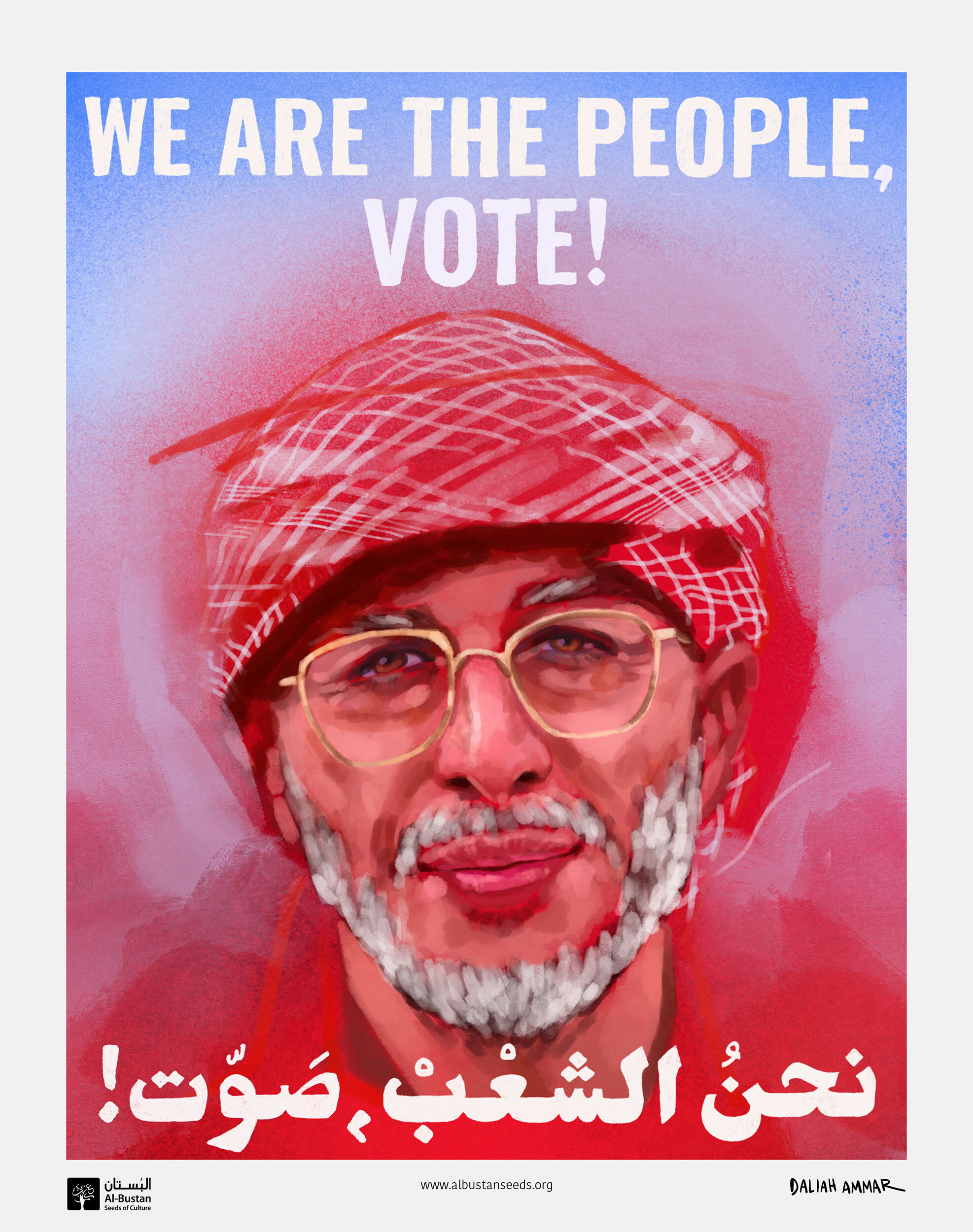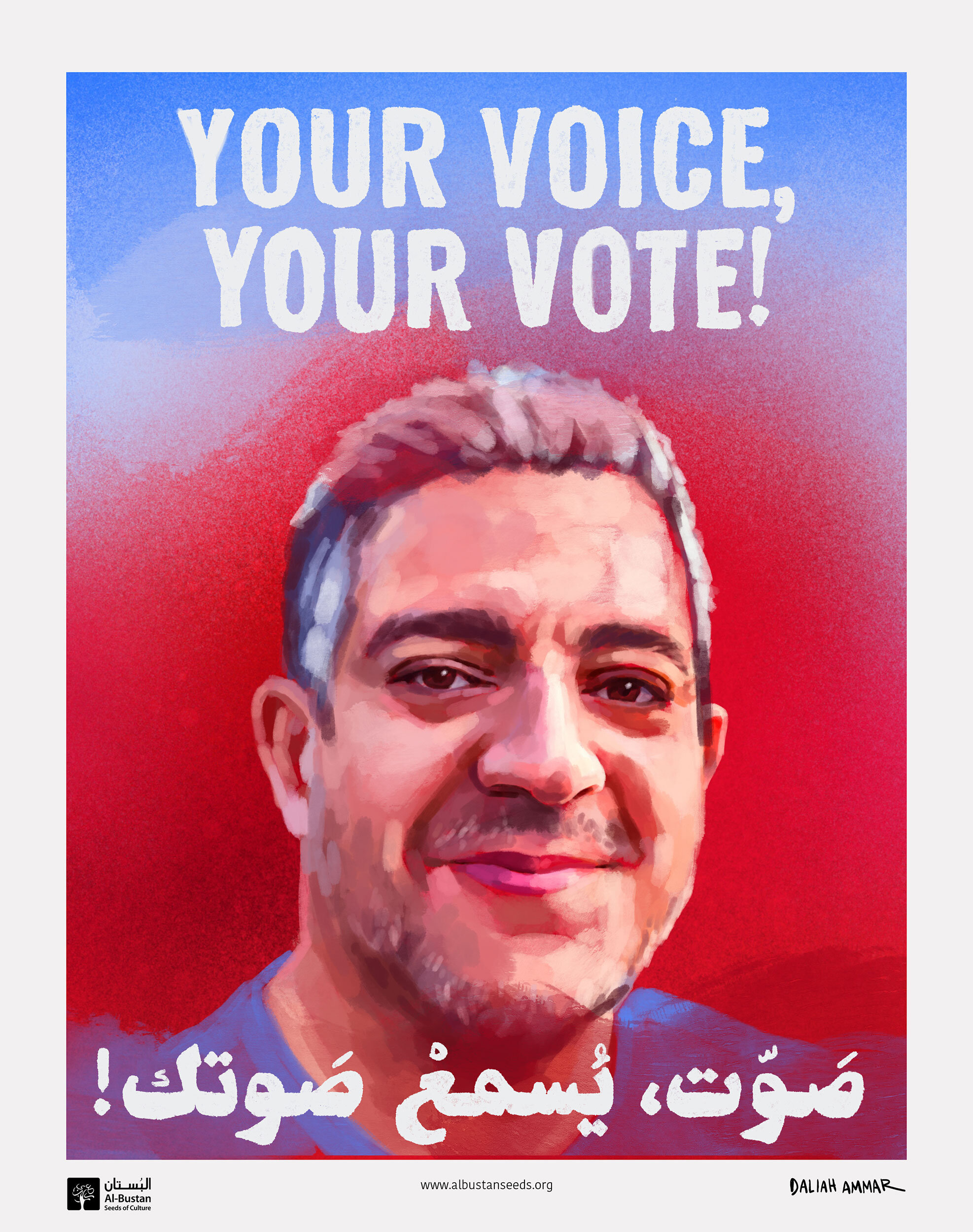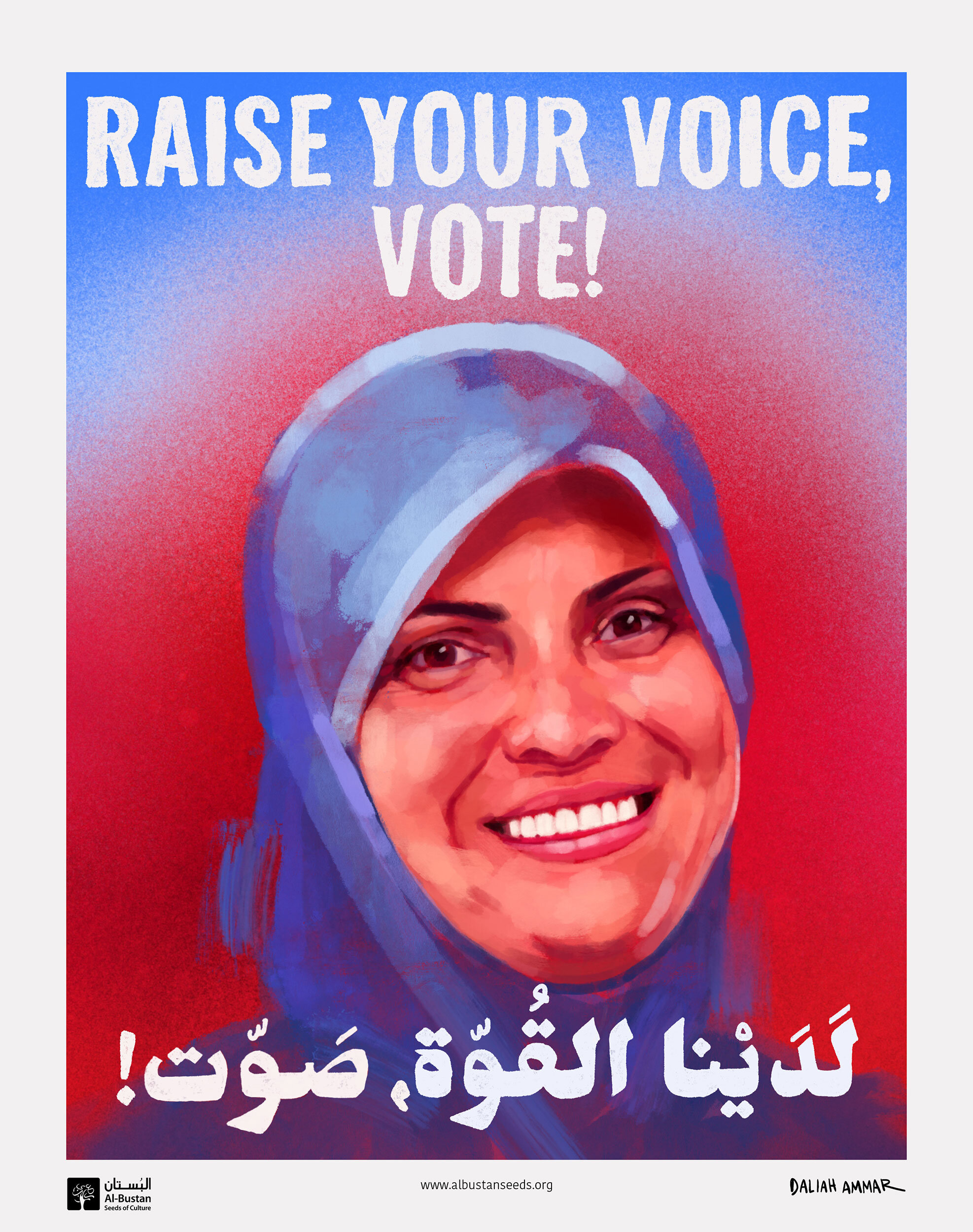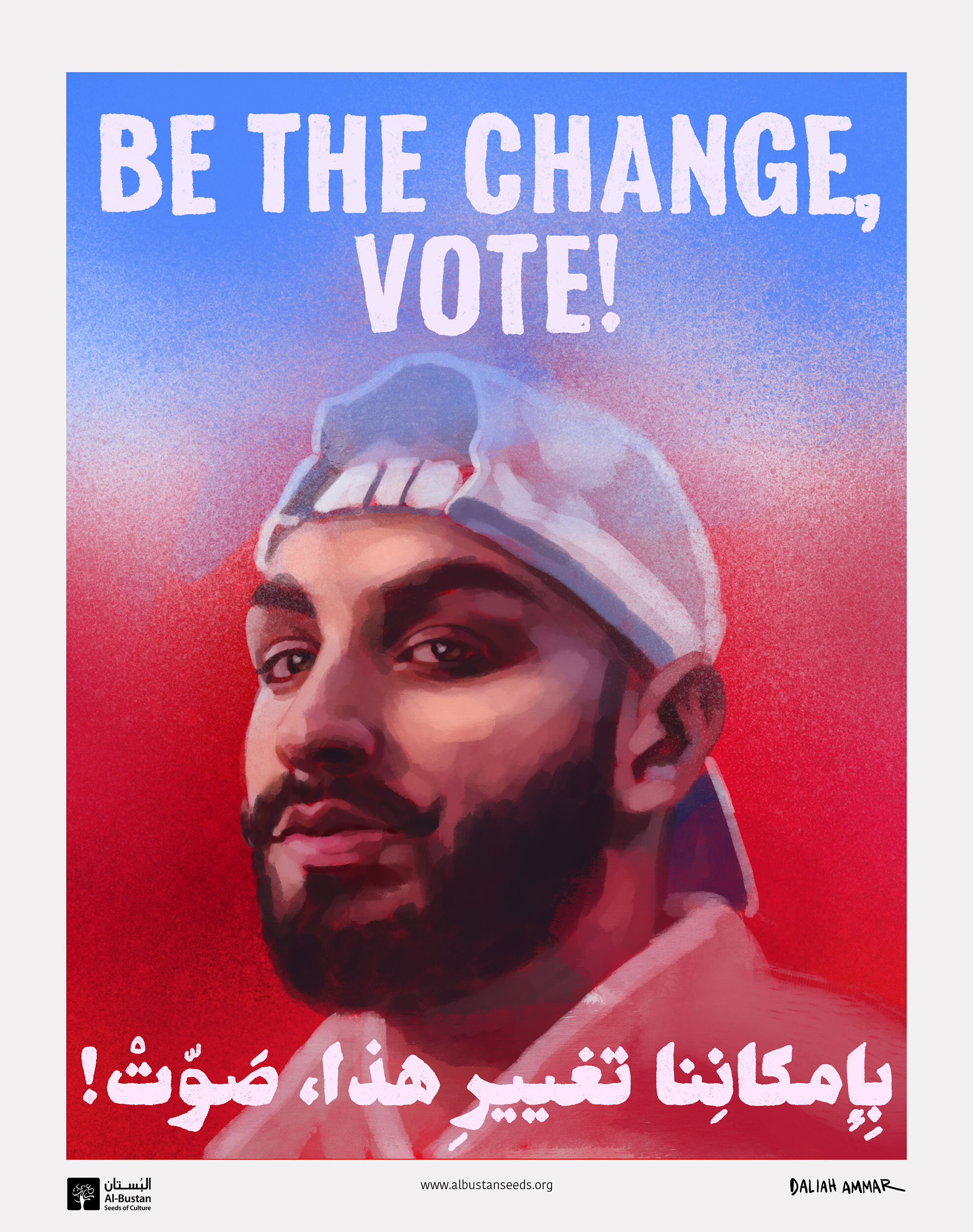 Our friends at Al Bustan Seeds of Culture in Philadelphia launched an initiative they call Sawwit: Engaging Artists for Civic Engagement. Al Bustan commissioned Palestinian American artist Daliah Ammar to create this series of bilingual posters featuring portraits of diverse people while highlighting the need to participate in shaping the future of our city and country. These posters have been put up in neighborhoods across Philadelphia and shared digitally across the country. Born 1995, Brooklyn-based artist Daliah Ammar grew up between the U.S. and Palestine. She will graduate from the Pratt Institute with MFA in 2021. See more of her art on Instagram.