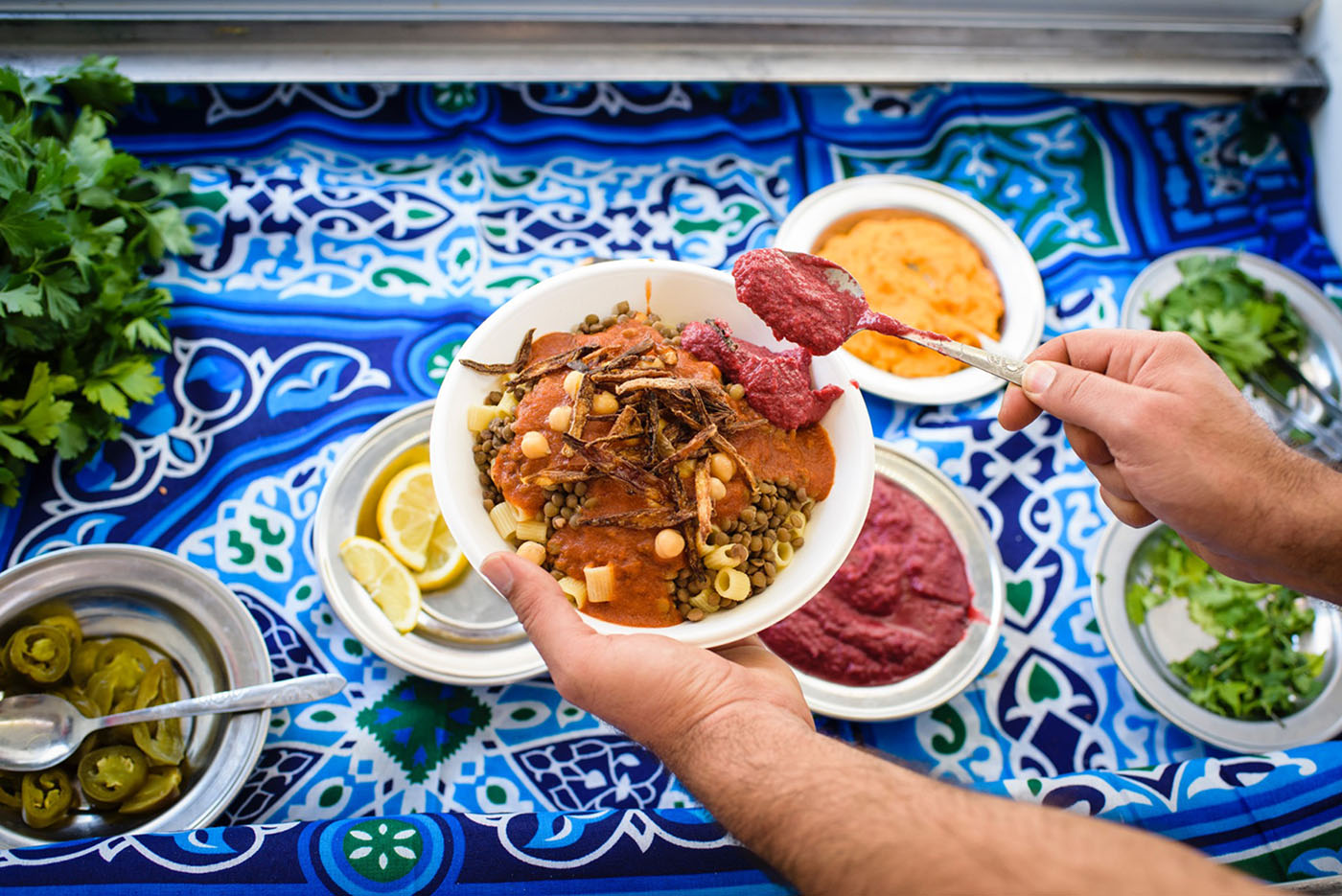Koshary is a dish that reflects Egypt’s history of the last few centuries, a product of colonization, migration, its egalitarian system and the economic conditions of the period. It is said the British occupation forces arrived in Egypt from India with the earliest version — similar to “Khichri,” an Indian rice and lentil dish. With the Italian and Ottoman influences in Egypt, pasta and tomato sauce were added. Our proximity to the Levant region resulted in hummus beans (aka chickpeas) being introduced to the dish. Finally, the crispy fried onions, hot sauce and garlic vinaigrette sealed the deal. Koshary remained under this same recipe for decades.