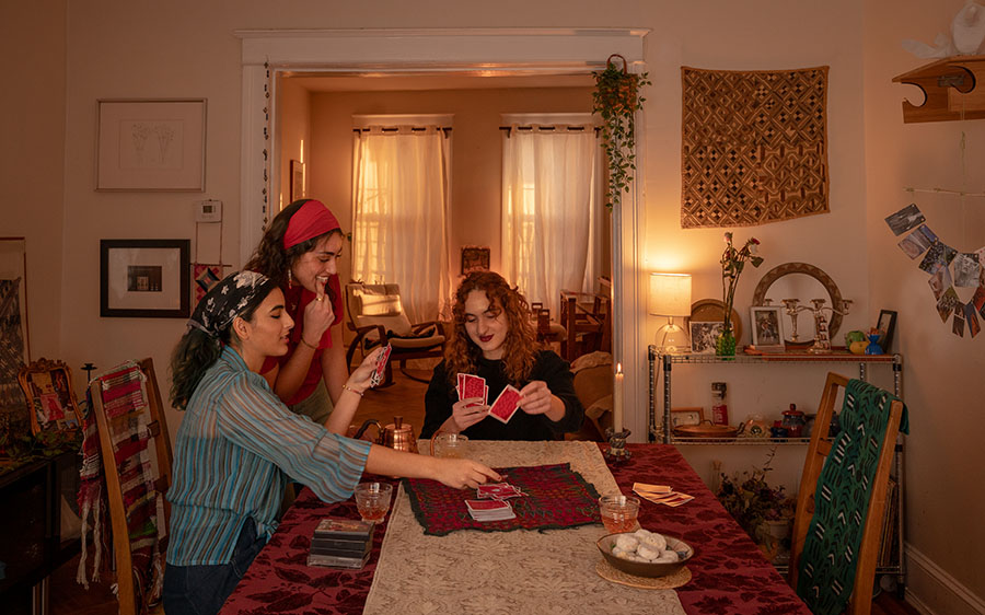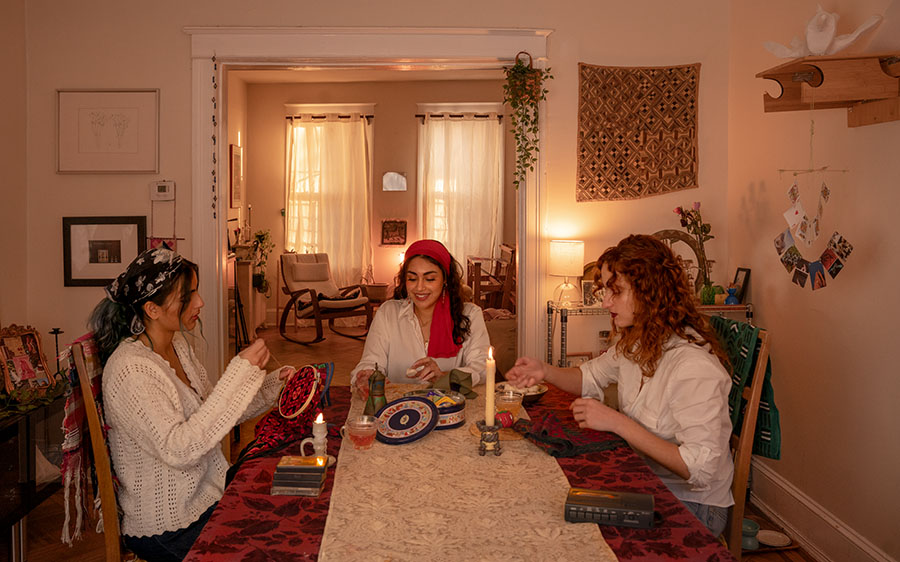 The initial segment of the series portrays Palestinian American women gathered around a dining table, partaking in shared meals, laughter, and the creation of art, all captured in vibrant, colored photographs. This tableau delves into themes of femininity, sisterhood, and cultural identity, illustrating poignant moments steeped in the nostalgic iconography familiar to Arab women: the peeling of potatoes, the intricate art of Tatreez, and the sipping of tea from a crystal set passed down through generations — the visuals embody a rich tapestry of cultural heritage.