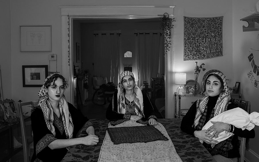 Although the women are featured together with bright smiles, an undercurrent of grief persists, noticeable by each contrasting frame acting a testament to the generational displacement, exile, and trauma witnessed by every Palestinian, whether they are in the homeland or abroad. In the alternate part of this series, the same women are re-imagined in black and white photographs, symbolizing the extension of the exile experience. These black and white photos resonate with the palpable grief and guilt experienced by Palestinians in the diaspora as they witness the brutal murder and oppression of their brothers and sisters in the homeland. In contrast to the initial frames, the women now are draped in traditional thobes and keffiyehs. They stand as a formidable embodiment of resistance and liberation, defiantly declaring the perpetual vitality of their culture.