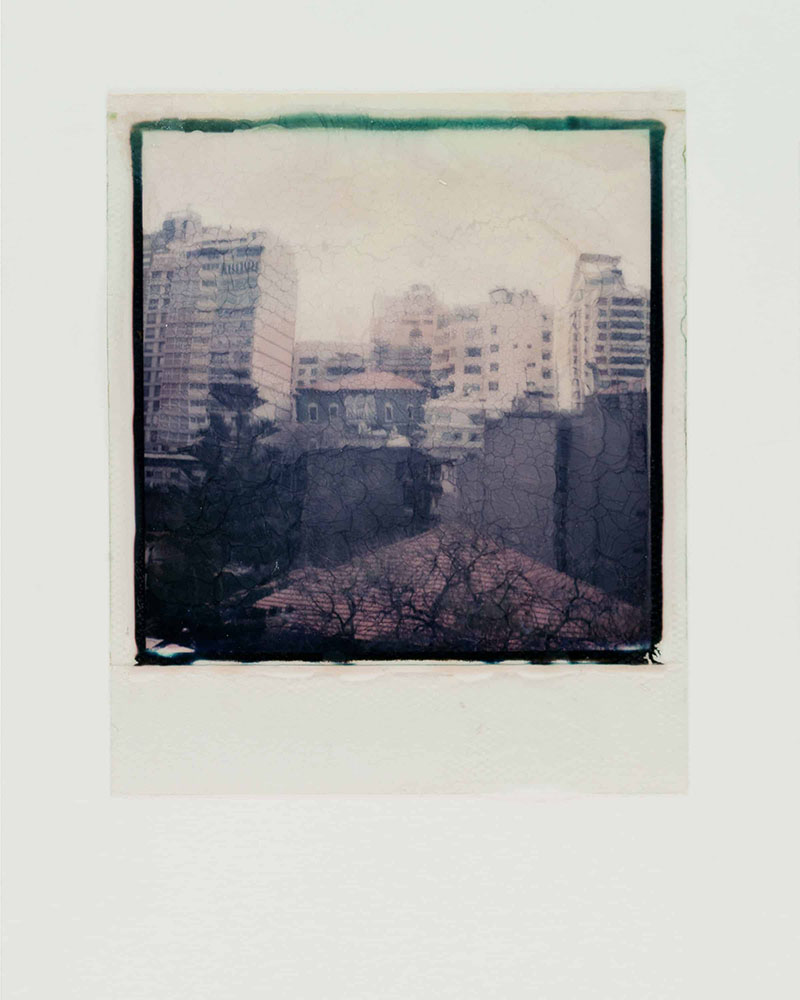 “I took Polaroids from my balcony, and then immersed them in hot water with vinegar to create a detachment. Images have two natures: the photographic emulsion of the Polaroid with what was photographed, and what is hidden, which becomes like landscapes of abstraction. These detachments or ‘antecedents’ are part of everything that is hidden from view. I wanted to parallel these two natures to talk about the idea of interiority: the interior of our images that is hidden, but also the observation of a landscape from the inside — as soon as we were confined — at a moment of floating in the history of Lebanon.”
