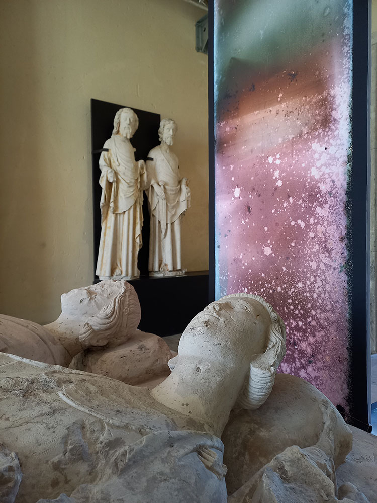 “The River” by Lara Tabet (2018), opens the tour, above the tomb of the Enervés de Jumièges. According to legend, the two sons of Clovis II were punished by being enervated, i.e., their muscle tendons were burned so that they could not move. The two princes were then placed on a raft without an oar or a rudder, and left to drift, at the mercy of the waves of the Seine, in the icy immensity, where the sky and the water merge, to end up stranded in Jumièges, where a monk from the abbey took them in and cared for them.