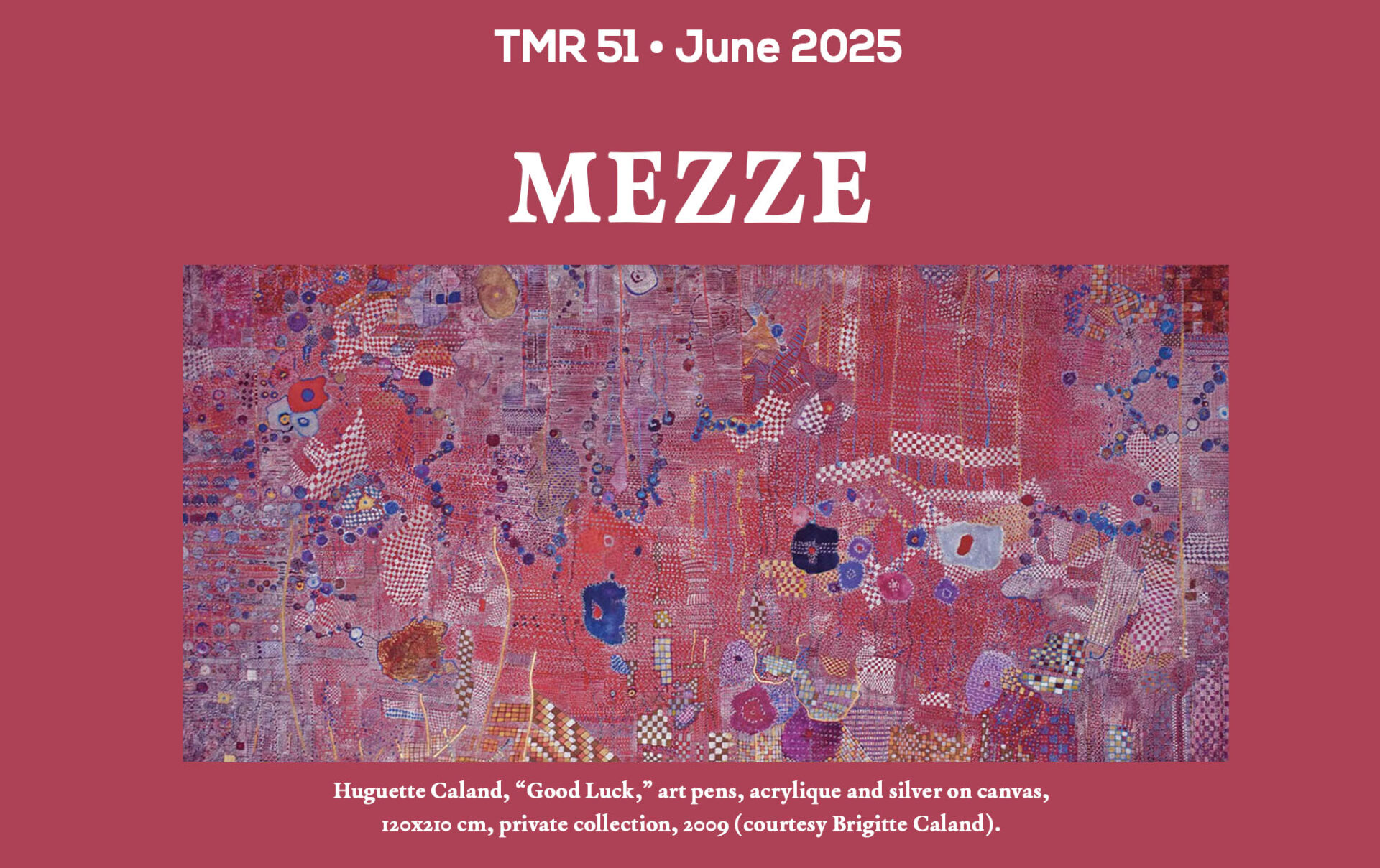 We’re not sure an explanation is required for an issue entitled MEZZE, but we are pleased to present our 51st issue, with an exclusive excerpt of the latest novel by Algerian writer Samir Kacimi, translated from Arabic by Rana Asfour, along with our centerpiece, “Mama’s Kitchen” by Lina Mounzer, our featured artists from Iraq by Hadani Ditmars, and a special essay on returning home by first-time Markaz contributor Amelia Izmanki. We also welcome back writers Naima Morelli and Aomar Boum with stories on art in Turkey and tirailleurs bandes dessinés, and Elias Feroz who turns in an interview with graphic novelist/reporter Joe Sacco on Gaza. Another first-time contributor, Hannah Kaviani, gives us a strong review on the new book by Sepideh Gholian, The Evin Prison Bakers’ Club. And our third new contributor — because The Markaz Review is always looking to work with new voices — is Aidan Simardone, with a smart art essay on the avant-garde Lebanese-Canadian Joyce Joumaa.