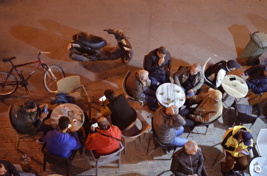 I arrive on the first floor and spot the only open door and enter it. There are three men standing around the door whom I ignore because I am scared that if I look into their eyes, they won’t allow me to enter. I walk in and spot the kitchen area of the café to my left, where a young man is preparing tea. I continue, ignoring his presence, scared of being spotted and kicked out at any moment, and I finally find myself in a dark room that smells like hookah. There are round tables everywhere, covered in red cloth, and there is not a single table that is empty. I walk towards the source of music and find an empty chair on a table already occupied. I suppress my intuition that tells me that I am not supposed to be there, and I pretend that I don’t know the norms that govern where my classed and gendered body is supposed to go and not go. I bring out my camera from my bag and start to discreetly take pictures, ignoring any gaze at me and my foreign presence.