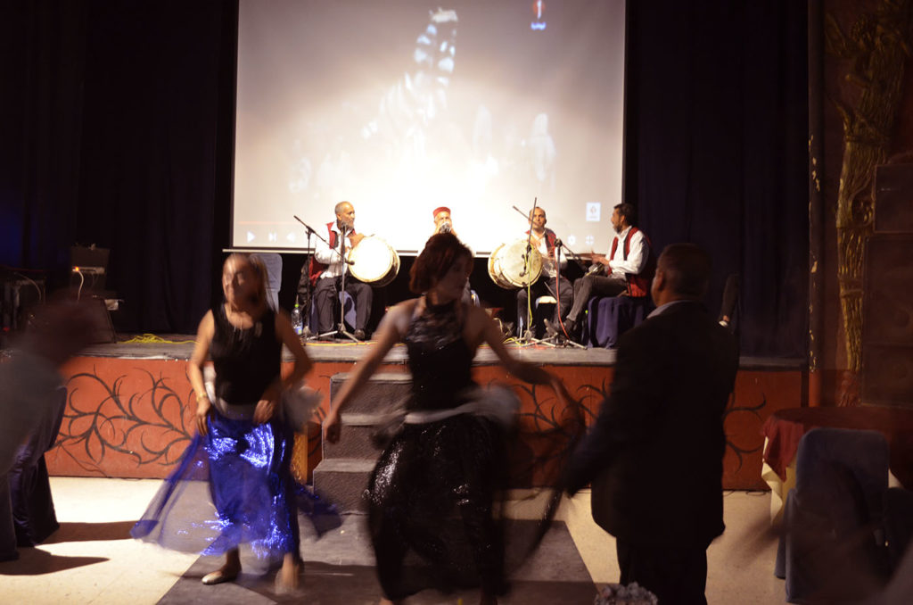 On the slightly mounted stage lit with round neon-colored lights, there are five men playing traditional drums and flutes. They all wear read chechia. A man dressed in a grey suit too loose on his frame is singing while walking through the audience. He has the turfs of his balding head gelled back; I notice that he is missing a few front teeth. Behind him, two women are dancing. They are both dressed in a black top, black leggings, and a translucent blue skirt that they wave as they move and swirl. I begin to have a constant desire to move in my chair, as if my body was itching, and probably a sign of my anxiousness; so I remind myself to perform my tourist-self – concentrate, smile, take pictures!