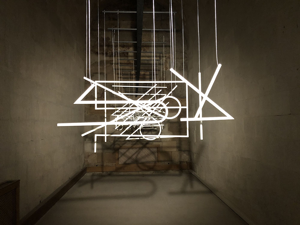 Moving closer to a spacious, grandiose domed hall hosting municipal exhibitions on topics like the diversity of woven carpet styles and the Armenian poet Sayat Nova, I found the other chamber installations increasingly inventive. Behind the darkness of a curtain in the cold cell, a work of metal sculpture and lighting design by Buşra Tunç entitled “Scratch” (2022), placed a number of suspending, calligraphic forms made with white bars, simply designed, like letters, asemic in their abstraction. As a projected light illumined the air with a fresh articulation of overlapping linguistic shapes, the artist’s vocabulary confronted the presence of mysterious engravings that continue to baffle archaeologists and historians throughout Sultan Han. The piece was harmoniously aligned with Mark’s and evoked the traces of extinct languages and bygone cultures housed within the rectangular enigmas of the caravanserai.