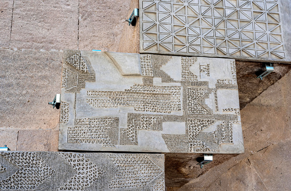 Yazılıkaya was a clever and studied feat of localized site-specificity, assimilated into Sultan Han’s ancient designs. (Without a map or placards, the artwork is practically invisible against the stunning internal facade.) Mark affixed the 23 concrete panels, inventively impressed with geometries and motifs that bear striking resemblances to medieval Seljuk design. The outwardly facing surfaces of a triangular stone stairway lead up to the window-like entrance of the building within the building where worshippers prayed. As the earliest Turkic dynasty to accept Islam, the Seljuk universe is studded with a tapestry of multicultural fragments gleaned from across the old caravan routes of Central Asia in such cities as Konya or Mardin, where competing Turkic sovereignties like the Artuqids were famed for building intricately carved stone structures across Anatolia.