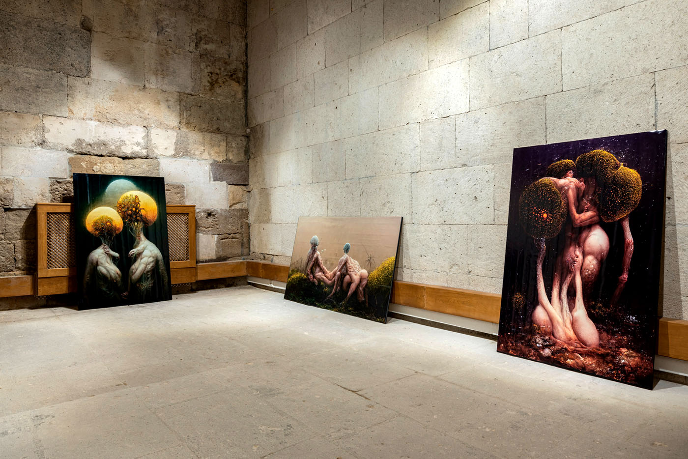 Placed in the chamber nearest to the main front gate of Sultan Han, Lewis’s works were exhibited beside those of Alejandro Figueredo Díaz-Perera, whose digital painting series “Protomother” (2022) is the result of a technological innovation in which an AI generator makes images based on simple texts. The absurdity of potatoes suspended at the end of twisted wire, along with a pyramid of tennis balls and discolored algae sheets had a disorienting effect within the overall ambiance of one of Turkey’s grandest landmarks. The dystopian evocation of lost space and passed time as phenomena of mutual dependence is all the clearer in Lewis’s work when set beside Díaz-Perera’s painting, whose title (“Protomother”) and content are derived from the meaning of the word “Anatolia,” which might be translated from Turkish as “mother-full.”