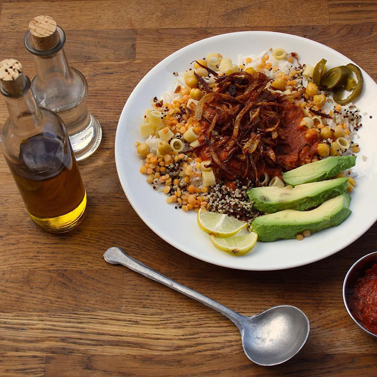 There was an attempt during the past few years to introduce koshary to the wider Berlin culinary scene through a mobile food cart called Kairo Koshary, which would pop up during street festivals and other open-air events, offering not only the Egyptian standard version of the dish, but also a couple of modified varieties. Koshary is among my absolute favorite Egyptian foods, and I seek it out wherever it is served. That’s why I used to check the schedule of this koshary truck whenever I was in Berlin; I wanted to make sure I was not missing out on anything. Theirs was actually a finer version of koshary than the one offered at Savignyplatz, but what was more interesting for me was the two additional varieties of koshary with a twist that the proprietors of the truck had developed. One of them was Moroccan/Casablancan koshary, with couscous instead of rice, and a topping of almonds, dried dates, and raisins, and the other was American/Californian koshary which featured quinoa in place of rice, and a topping of sliced avocado. I did not actually like either variety, but for me they represented creative attempts to adapt the dish to various tastes, among Arabs and non-Arabs alike.