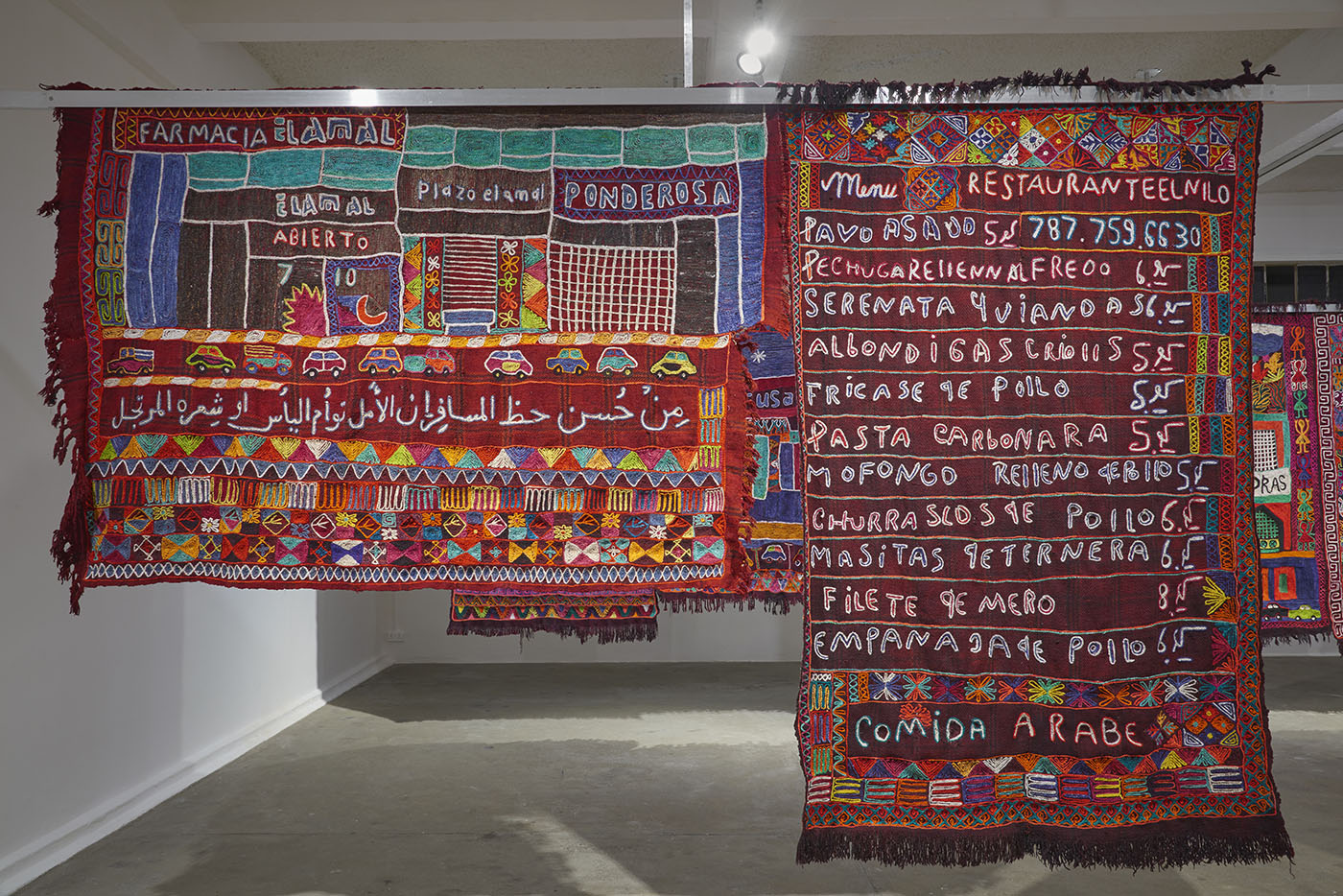 The artist refers to the history and layering of migration stories here, one generation of shop owners or restaurateurs or pioneers leaving way for the next, creating a historical/cultural timeline. The images are not only beautifully crafted by the Iraqi weavers in a traditional method of flat weaving and chain stitching, the bright colors and playful Latin rhythms in the works also evoke the way that Palestinian and Arab migrations have created their own history and traditions within the region. The sayings and shops, the menus and mosques that have sprung up within daily life, weaving themselves into the life of the towns’ inhabitants and adding layers of richness to their socio-cultural make-up.