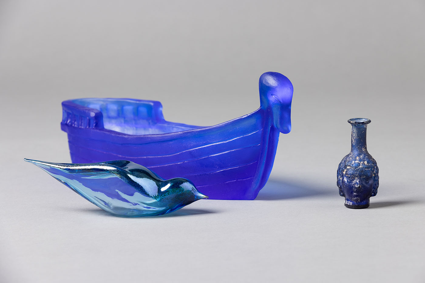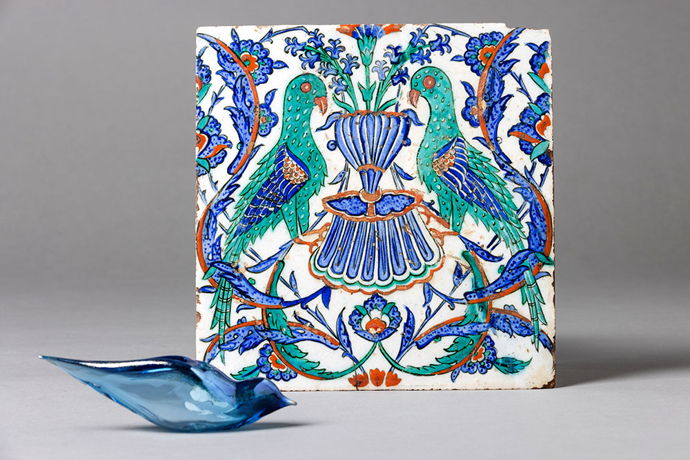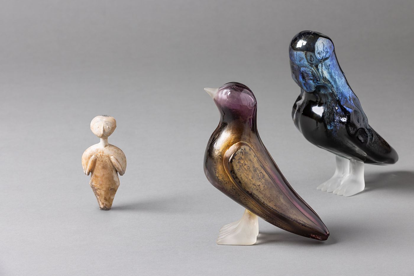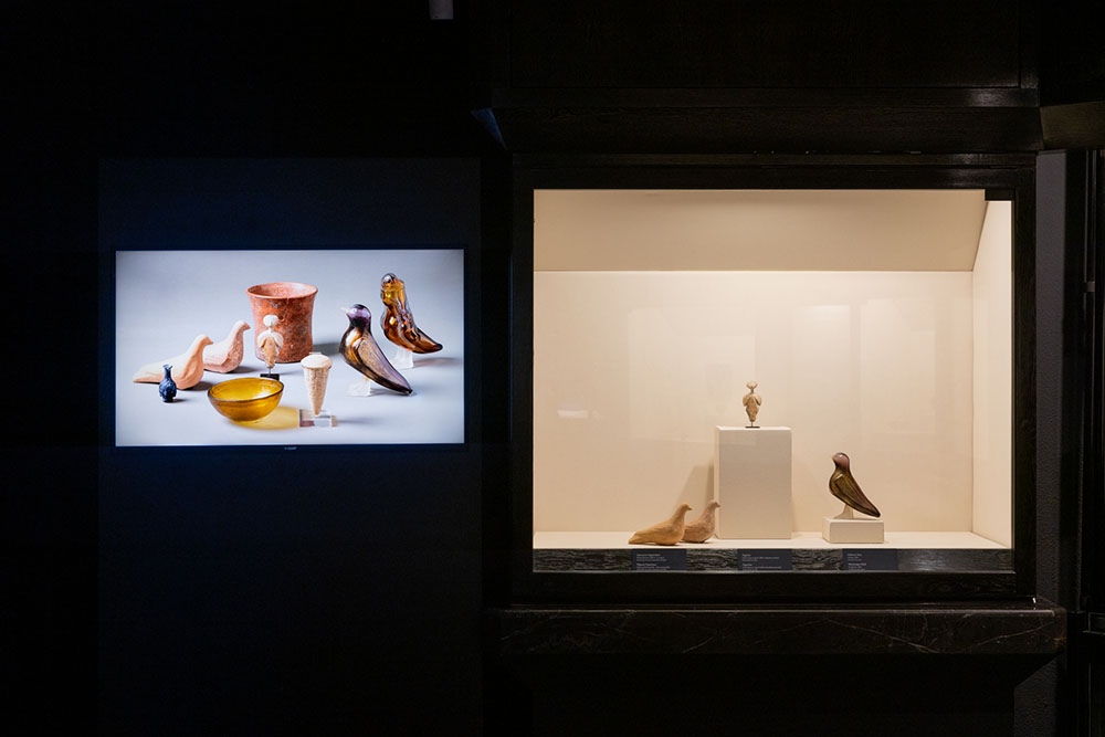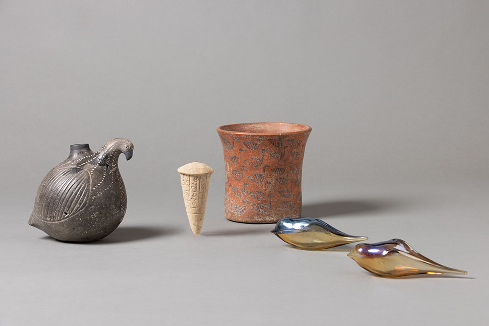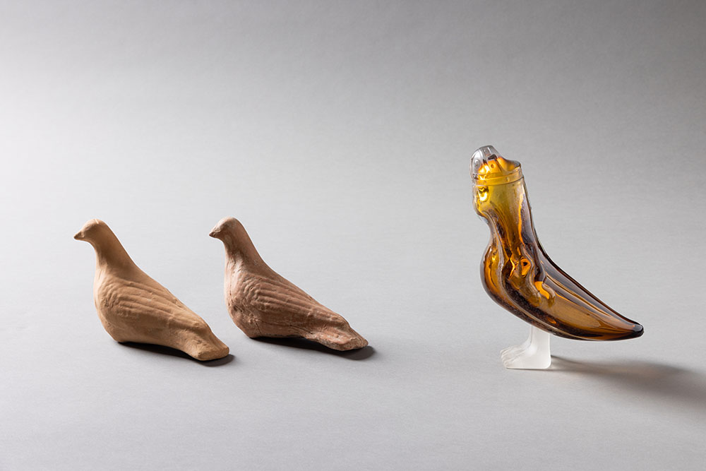 In other vitrines around the room, Onar’s new works are placed in their own conversation with 11 artifacts she and Amaya-Akkermans selected from the museum’s collection, including a 4,000-year-old partridge-shaped rhyton (ritual drinking vessel), a ceremonial terracotta nail with cuneiform inscriptions from the Sumerian period, and an Ottoman ceramic tankard decorated with images of sailing vessels. A boat-shaped, turquoise-glazed ceramic bowl from the Seljuk period decorated with mythological siren figures resonates with Onar’s kiln-cast glass boat in royal blue representing Odysseus, while two terracotta pigeon figurines from the classical period so resemble the form of Onar’s Perched birds that, she says, “they could have been made by my own hand.”