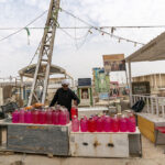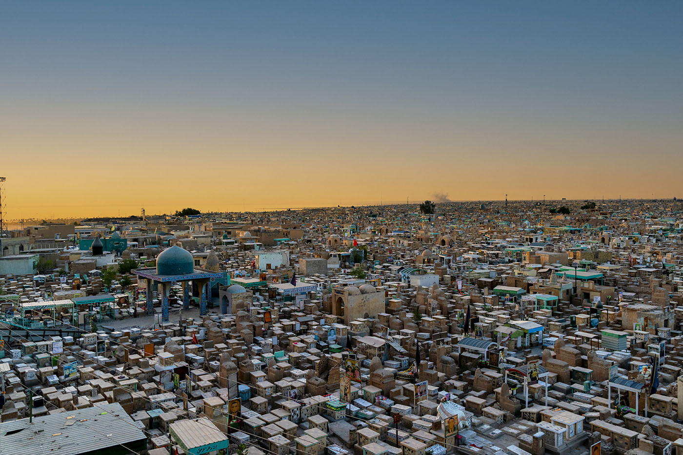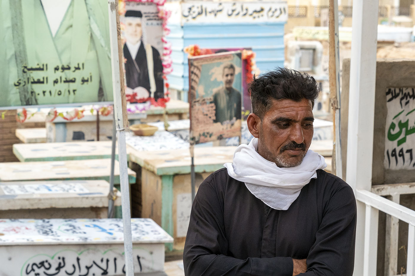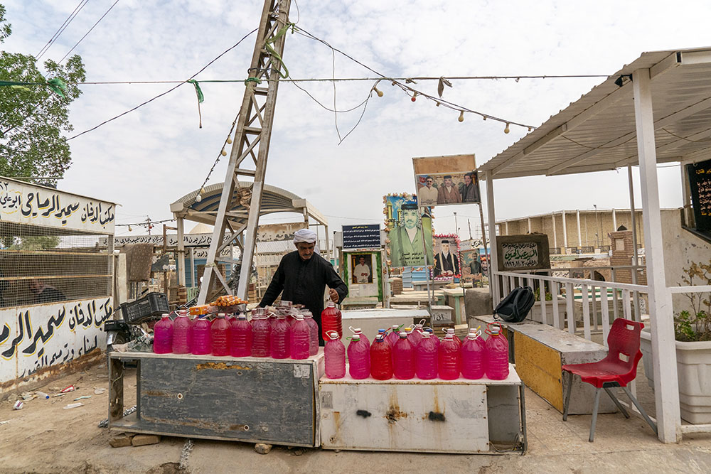 Now, Hussein spends his days sandwiched among tombs, selling incense and jugs of hot-pink holy water in the Wadi Al-Salam cemetery — the world’s largest — in Najaf. “I was on the green land — my land, my trees. Now, as you can see, I am only among the dead,” he says, sighing heavily.