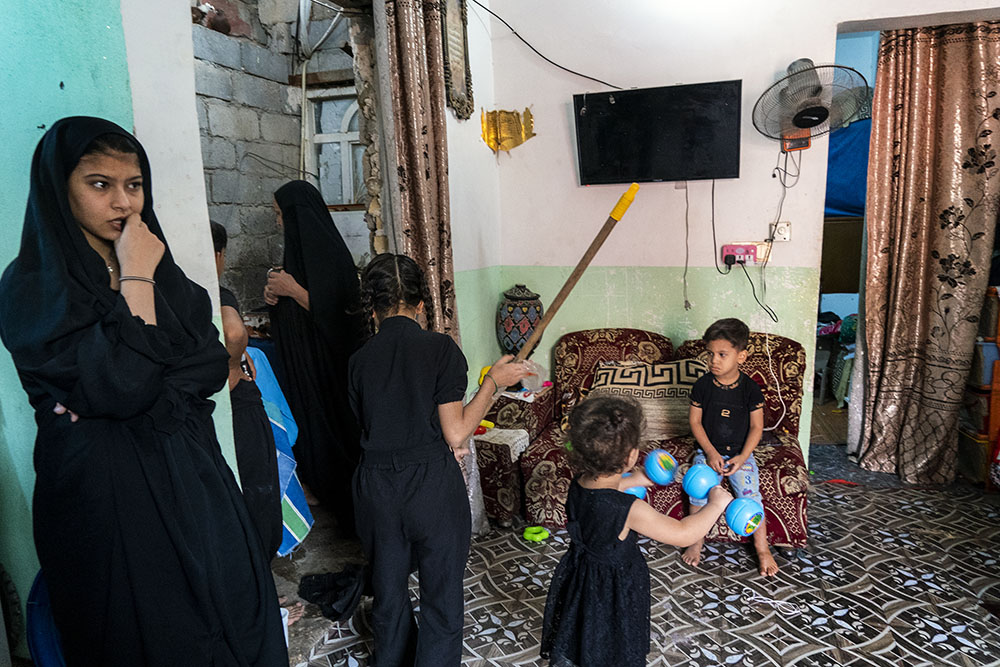 Once a wealthy farmer from an important family in Al-Gatre, Sajjad Abu Karrar, 50, now tends a plot of land in the middle of a busy Basra roundabout. He lives nearby with his family in crammed windowless rooms that he gets in exchange for looking after the building next door. The $200 he earns a month is a pittance — and nowhere near enough for the family of seven. The struggle to survive on his meager salary aggravates the stress exerted by the profound loss of being forced by drought and water scarcity to abandon his family’s land. His marriage is showing signs of strain. Shorn of the important role women played on farms, Abu Karrar’s wife Nowali Khalilaf, 49, is depressed and isolated. With no community around her, no identity, unable to make ends meet on her husband’s salary and unable to contribute, she rarely ventures outside their house. Dejected, Abu Karrar watches as she leaves the room with her four-year-old granddaughter, Zahara, grasping her hand. “Of course, I miss more than my land,” he confides. “I miss my life, my history — my everything. I look at a picture. I miss my land, I miss when it was green, I miss my vegetables, my fruit … it makes me so sad.”