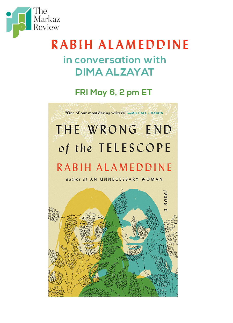 Rabih Alameddine, winner of the 2022 PEN/Faulkner Award for his latest novel, The Wrong End of the Telescope, will be in conversation with short story author Dima Alzayat (Alligator & Other Stories) for The Markaz Review, on Friday, May 6, 2 pm ET (19:00 UK). Zoom participants will be able to jot down their questions in the chat for Alameddine and Alzayat.