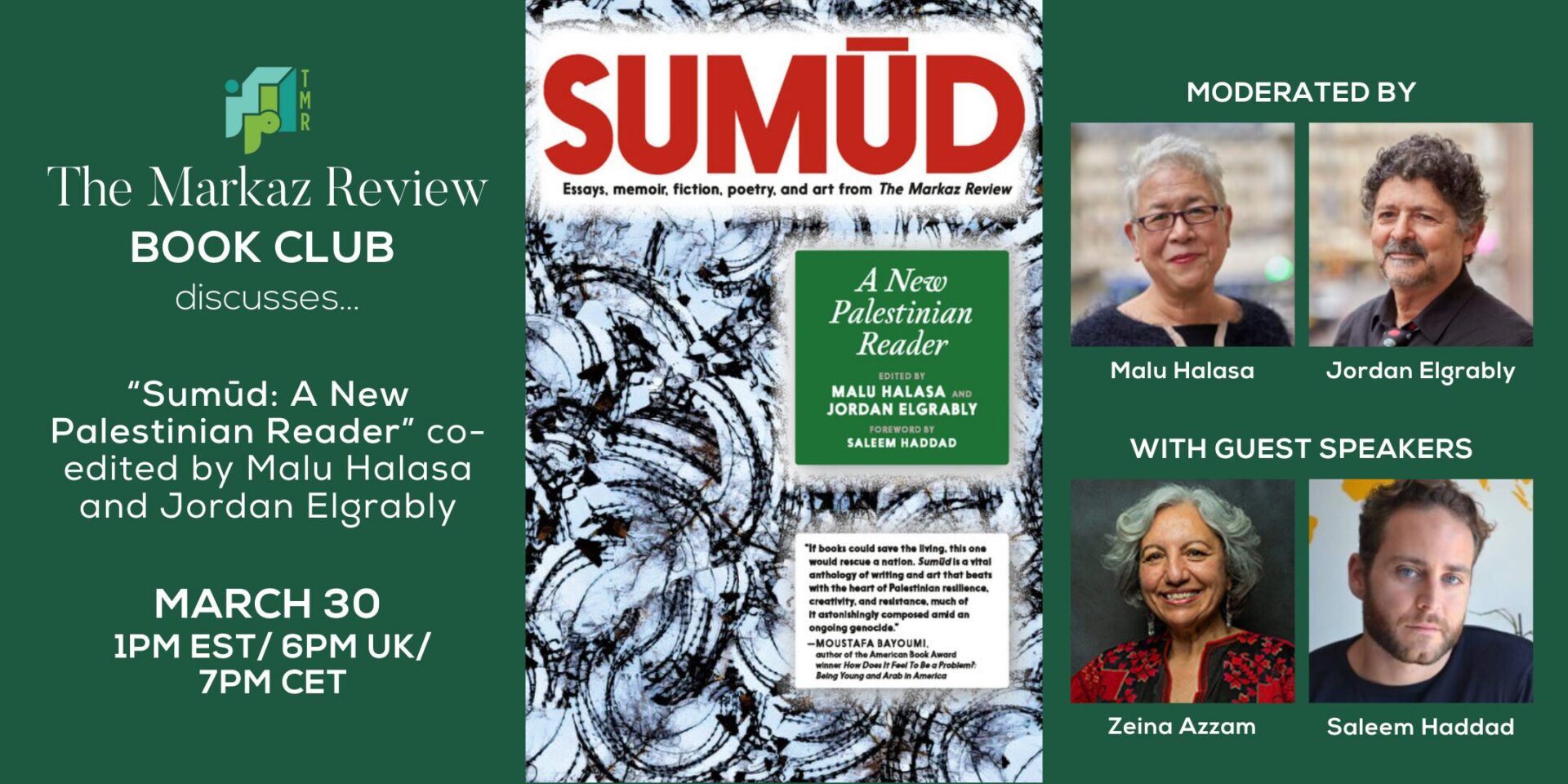 Join us to discuss “Sumūd: A New Palestinian Reader” online with special guest speakers Zeina Azzam and Saleem Haddad on Sunday, March 30th at 1 pm Eastern/19:00 CET. Moderated by co-editors Malu Halasa and Jordan Elgrably.