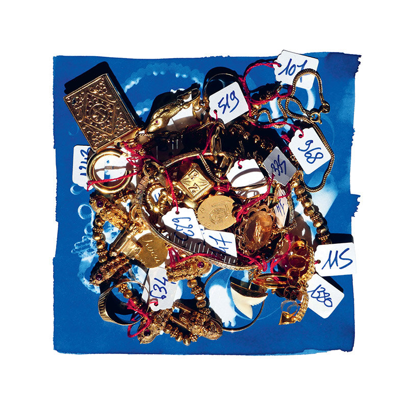 The jewelry used in Lazare was purchased at the Crédit Municipal de Marseille over the course of 12 months. At these auctions the description of an object is concise (to put it politely): “Bracelet, gold, 38.3 g”. Why? Because the only detail that matters is its weight: the vast majority of the jewelry is bought by gold dealers to be melted down. Age, craft, beauty count for nothing. In one brutal acquisitive act its form, but also its “meaning”, its human history, will be erased. Where did it come from and what does it represent? What sacrifices? What journeys? What joys? What hopes?