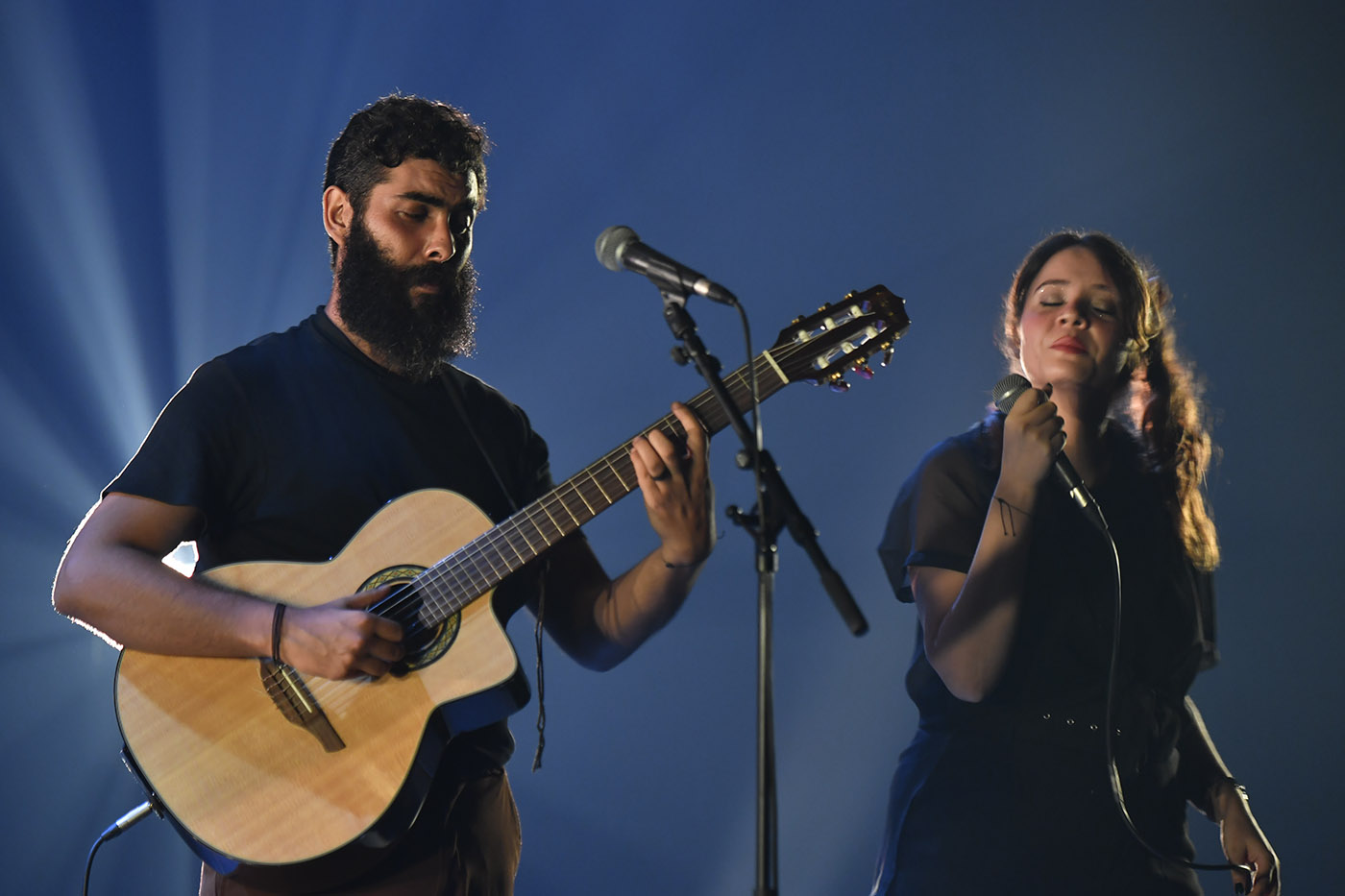 On this same stage, we wrap up with Ÿuma, because we cannot mention all the artists, as the Festival Arabesques this year was so rich. Ÿuma consists of Sabrine Jenhani and Ramy Zoghelmi, a Tunisian duo with two voices and a guitar, whose minimalist folk universe contrasts with the urban productions of the new Arab scene. They are multidisciplinary artists (she graduated from École des Beaux Arts in Tunis; he comes from the cinema). The two amateur rockers spontaneously found themselves in the acoustic softness of intimate songs, but also in a militant approach.