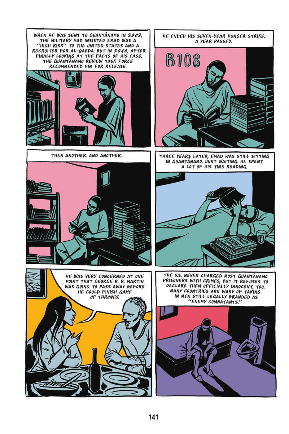 I’ve worked to make this graphic narrative a nonfiction accounting of real life. The chapters in this book are all based on original interviews I did, as well as interviews conducted by Columbia University’s Rule of Law project, and journalistic books about Guantánamo. Whenever possible, the illustrations in this book are based on photo and video references. However, because it’s impossible to document what happened in every scene described in this book and the military does not allow media to photograph prisoners and many prison operations at Guantánamo, the artists have used their creativity to fill in the gaps.