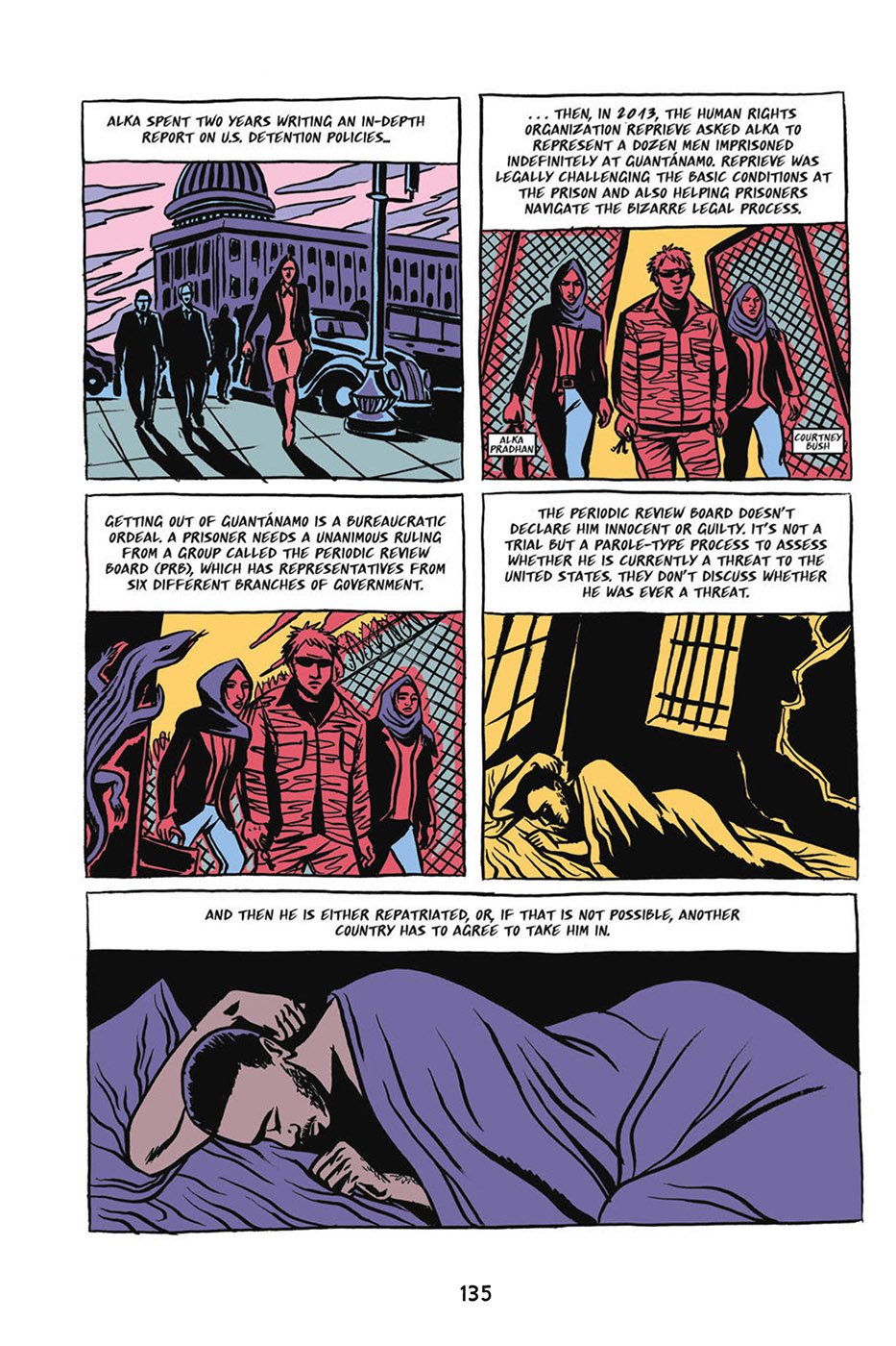 The chapter here features the story of human rights attorney Alka Pradhan, defending a man incarcerated at Guantánamo, and is illustrated by Lebanese graphic artist Tracy Chahwan: