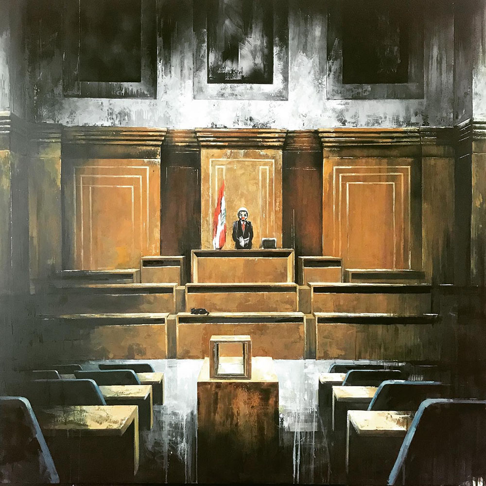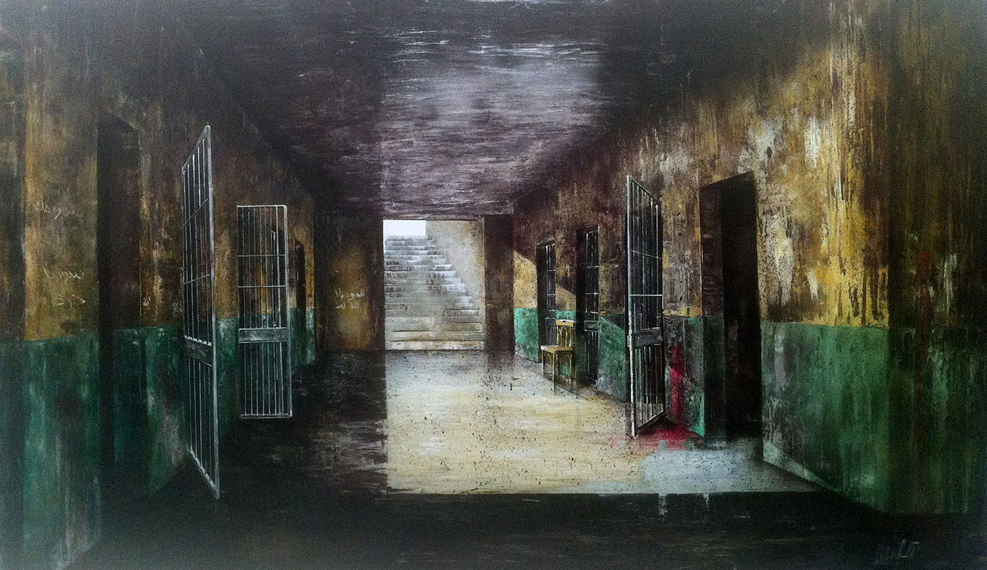 The “stasis” or stagnation has reached Beirut, the artist’s city of choice. The combats are scrawled on the city walls in Syria and Lebanon, through graffiti as “a reminder that the spark of rebellion comes from the people,” as Al Mufti puts it. Thus, the Syrian revolution would be the subject of a solo show in Beirut in 2013, Perspectives of a Revolution in Progress, at Joanna Seikaly Art Gallery. By showing a Syrian prison cell imagined according to the stories told to him by a former Syrian friend who was imprisoned, he revealed the state of abandonment that characterizes both cities, and what this carries with it of “violence, social collapse and separation between social classes.”