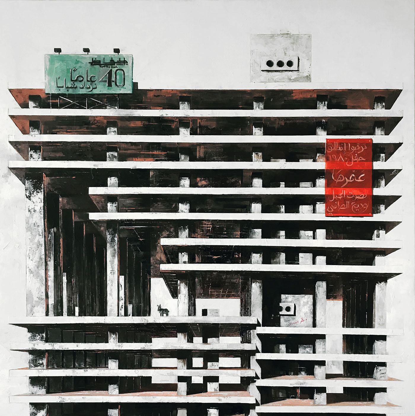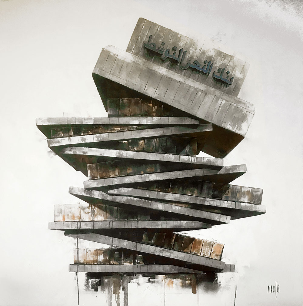 With only his paintbrush and T square, Syrian architect and artist Mohamed Al Mufti settled in Lebanon in 2012, a year after the outbreak of war in Syria and the disillusionment that followed the first stirrings of a revolution aborted in blood. At the time, Beirut was not yet marred by violence and deprivation, and being in exile sometimes allows for talent to explode, forcing one to look within oneself for resources. After a few difficult years in Lebanon, during which he concentrated on teaching and his art, the prolific artist’s career took off. He exhibited in Beirut and Paris and contributed to numerous group shows in Europe. He has a lot to say and to remember, because everything in 20th and 21st-century Syria and Lebanon is left to either fade away or rot. Pre-occupied with memory gaps means that collective memory, its symbols, and their reinterpretation are at the heart of his exploration; for he believes that he who has no memory has no future.