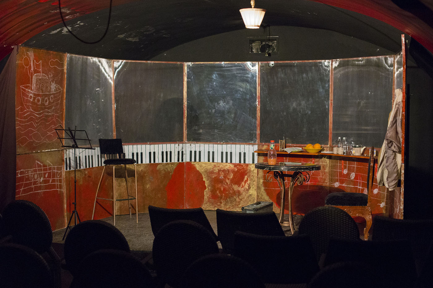 I spotted an acquaintance and asked if she too had come because of the Instagram announcement. She said yes and seemed to generally know more about what was happening than I did. At least she knew who the playwright and the director were. Inside, they didn’t give us any program notes. I found a seat and kept my eyes on the actors, all of whom were already sitting with their backs against the stage wall waiting. None of the actresses wore hijab, including my friend who wore a simple short skirt, sleeveless shirt and stockings. There were easily over 300 people in the auditorium. A stage-hand stepped up and addressed the audience, asking that we turn our cellphones off or put them in airplane mode. Absolutely no photographs were permitted.