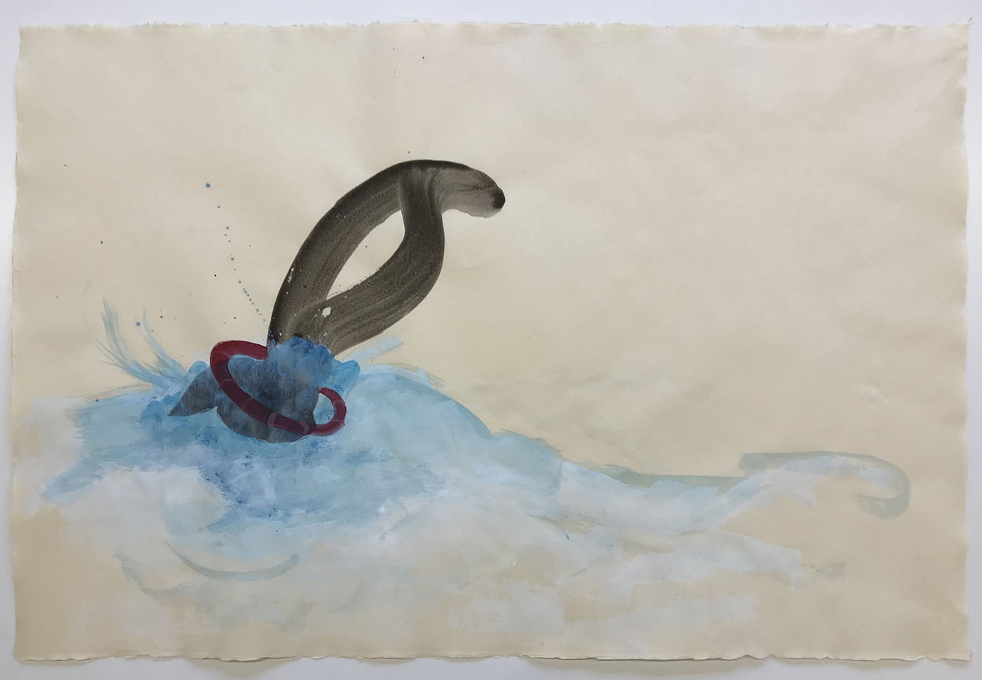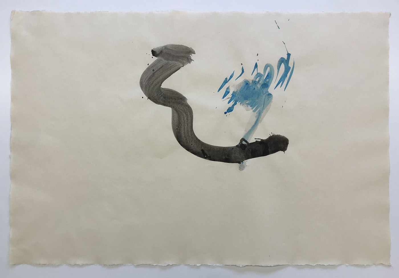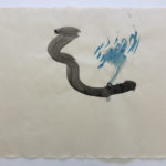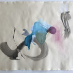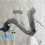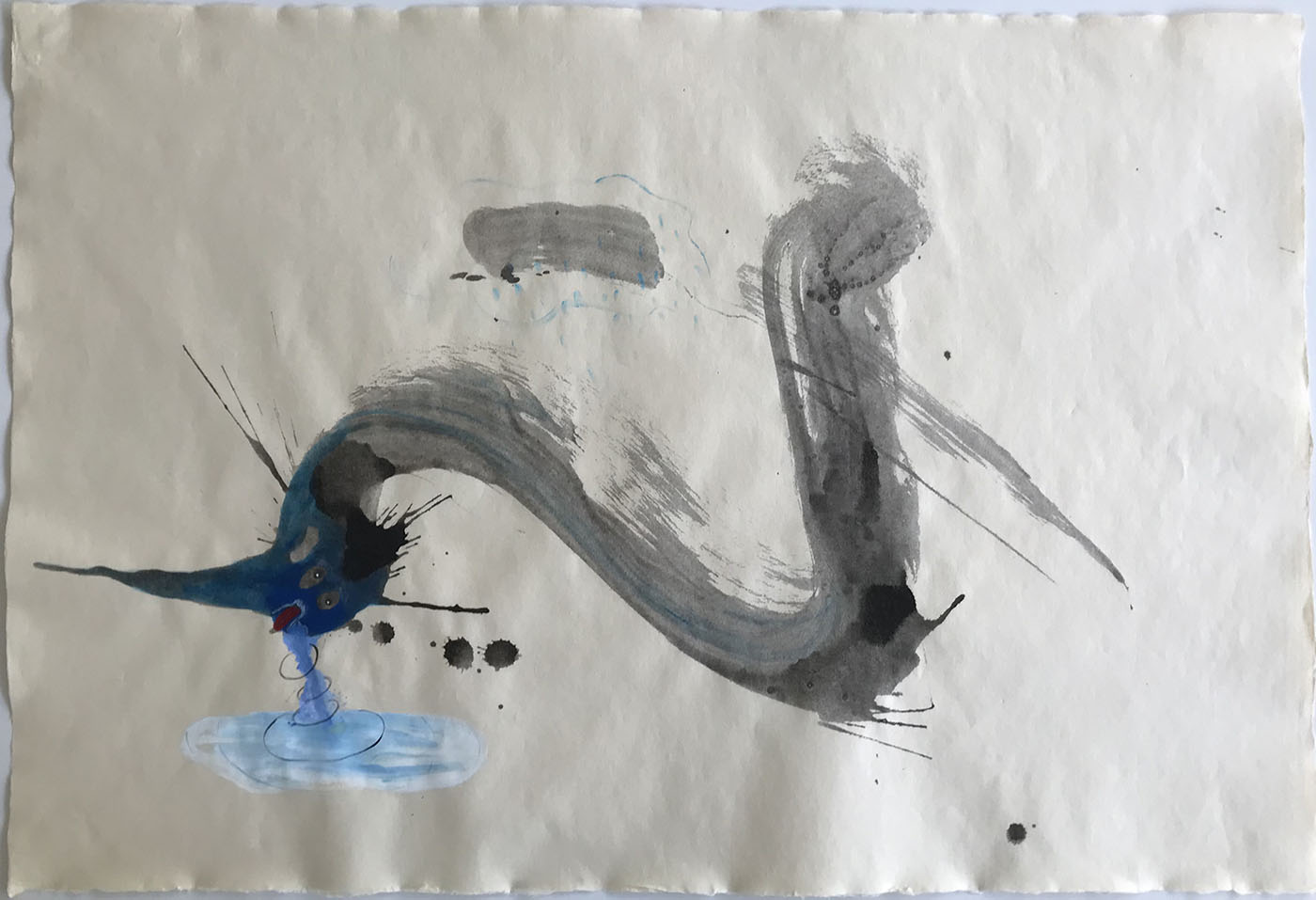 His painting practice activates Asian inks and brushes, in the mode of the Zen mind or brush, the art of black and white, of art made only with one brush, and art that is engulfed by a flow of forms, all bustling or dancing or fighting around one black stroke. His knowledge, world, and decisions travel with the speed of a thought, from the far east to where he is and was, until these forms start to speak. In the process of drawing, he identifies some shapes that could look like eyes, works them out until just before they become a painted eye, then he remembers the simplicity he learnt from the east, and pauses, “what do I want from the eye, what is the most essential in the painting of an eye? The glare! I worked on the glare detail in this eye. In Die Flut, I focused on movement of water, and in some works mud popped up. Besides black, blue was a main feature in many of the pieces, but each piece had its own logic and impressions on me.”[4] Just like Du Fu’s poem, characters or elements of storytelling here are brief but poignant; blue indicates a war but does not illustrate it, and body is the same wherever it is placed.