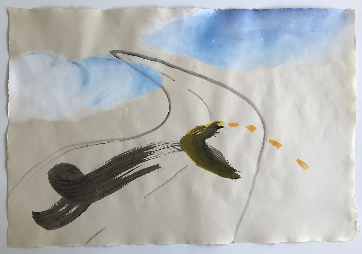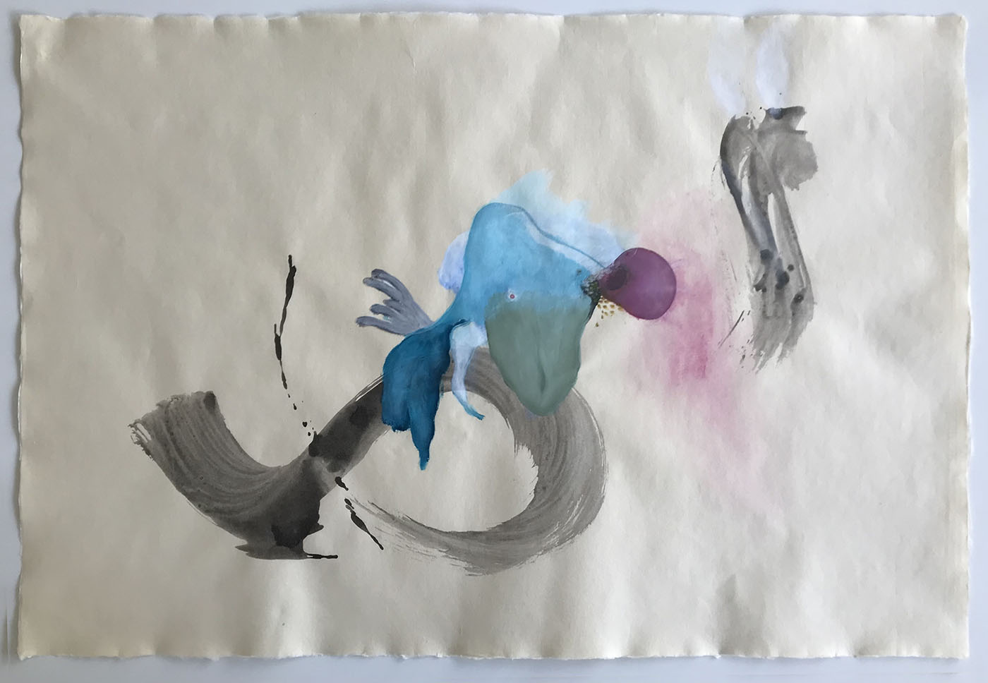 In Berlin, Ali works in sessions but has never moved his brushes between his studio and home. He starts by mapping the flow in the works using Chinese ink, studies their look, starts with the simplest and leaves the complex to later. It is like a casual Sunday run, he says, one starts with warming up, then jogging, then running in place. The artworks converse throughout the process, and creatures (human, animal, or other) start to appear in them. He does not work from sketches or prepared drawings and so the creatures pop up unexpectedly from impressions in forms he had just worked on. Ali uses the space of these paintings to reflect with himself on himself, the childhood he had in Baghdad, its fall and looting that he saw live during the US-led invasion and occupation of the city in 2003, and the journeys he had to take into the exile from 2008 onwards, starting at the age of 15 years old, and ending in Berlin.