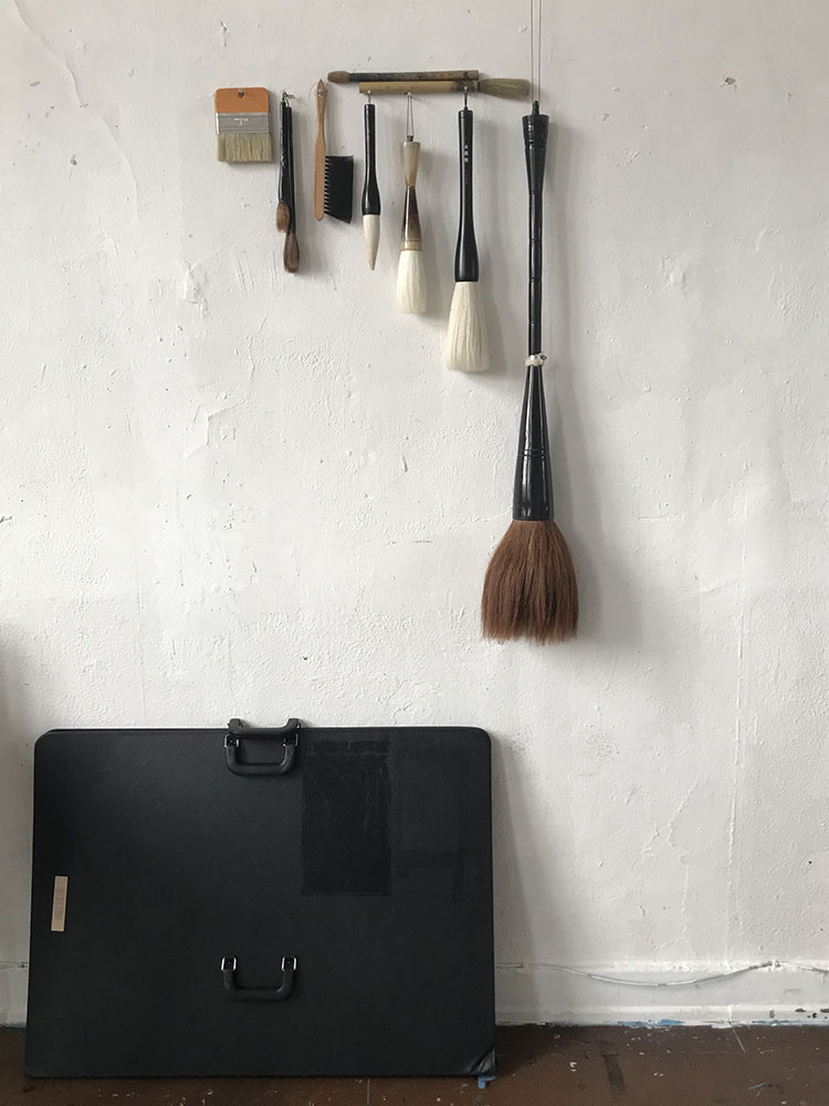 In his class collective studio at UdK Berlin, with Hito Steyerl, Ali counted 33 brushes, seven of them Japanese, including the biggest brush, while some are Chinese, as is the ink.