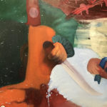 These characters, or motifs, reference, respond and repeat around these traumas, desires, thoughts, and/or emotions in Ali’s life. The motifs have a status, not a life, because they are from the mind of the same person. Together they make sense, they reference a status or situation; a sitting or extended leg is a tired one, a running impression signals hard working, some blacks are eyes, others are beards or moustaches, and so on. In live drawing sessions at University of Jordan, Ali painted models from their knees downwards. The thigh appears as an obsession in his work, birds also appear, and some beasts, people with moustaches, his friends, including the Paris-based Iraqi artist Himat. These characters age, sometimes they retire, or leave the works and new characters come in their place. The characters are not fixed, they appear to tell a story, often stuck within the realm of the canvas, and they travel with Ali, to wherever he takes the canvas, home, university, metro.