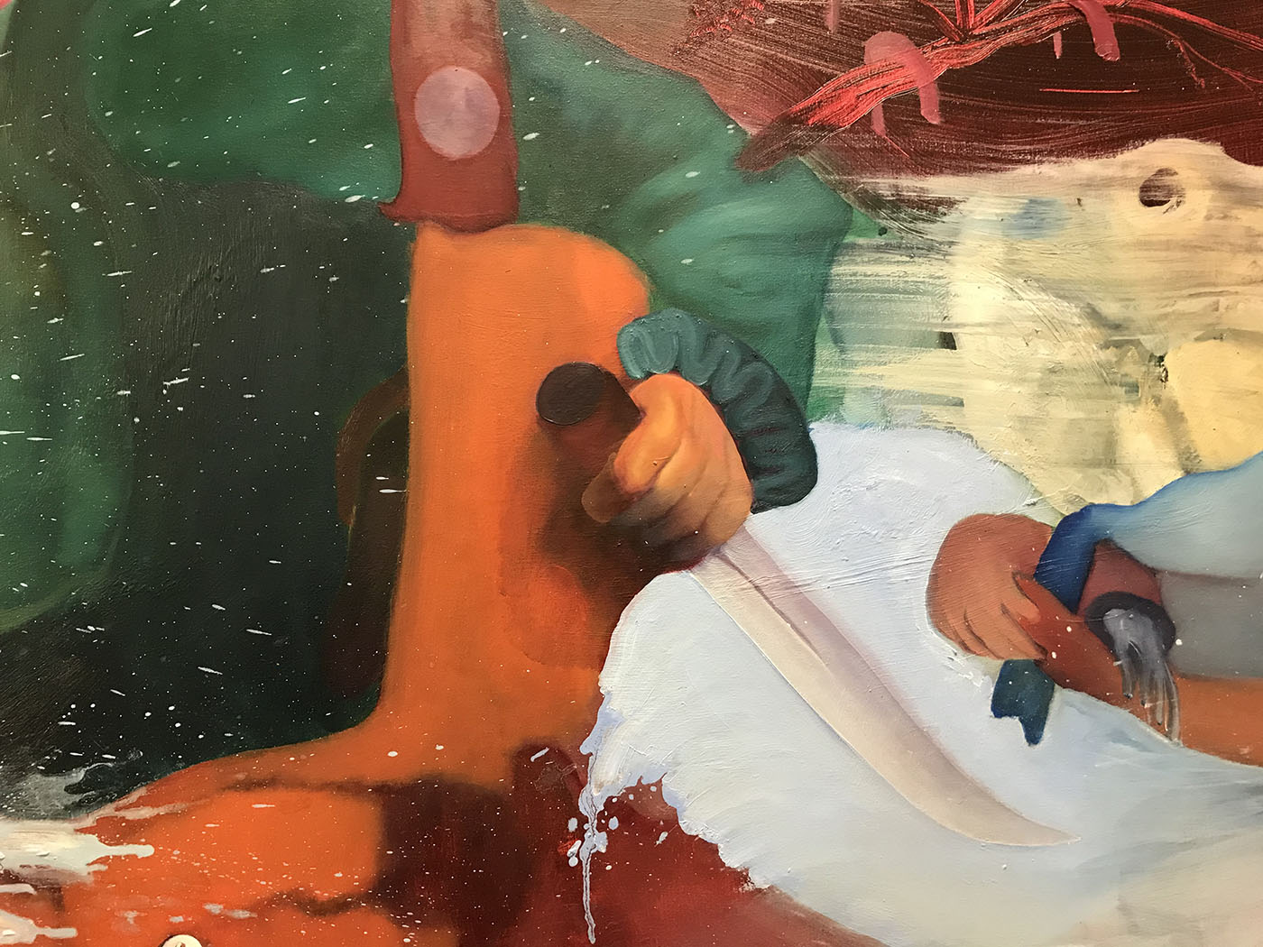 Ali had not painted a palm tree since he left from Iraq. Only trees that he encounters in his present (German) space appear. What he is sure of, is that his color palette has changed from the almost monochrome he painted before coming to Berlin. “The colors here came out clearer and more vibrant. Riding on a bus in Jordan allowed me to see an open horizon as if I were floating. In Berlin, I only see trees very close to the windows of the train I take to my place. During my first months of arriving in Berlin, I always wondered why art students in Germany painted like Gerhard Richter, until I noticed fragments of his textures started to appear in my work! You will always be in the state of a moving object, like trains, you will always see blurred scenes. From Amman, many people (and creatures) surface in my current work, but not the place which I cannot reproduce but in what is available for me to shoot or capture. In film or moving images, I am always calling the current space to speak about that other place. I could talk about that moment of resistance in Baghdad, but I had to produce in a metro in Berlin. I have to find a way to change it to describe a place that I am not in anymore but have a story to reference. Sometimes, it can be an advantage to not have access to a particular place, so you have to reform and readapt your point of view towards the story, and try to make new associations according to your current possibilities. This will create a new momentum which bridging these two places, and connect these times together.”