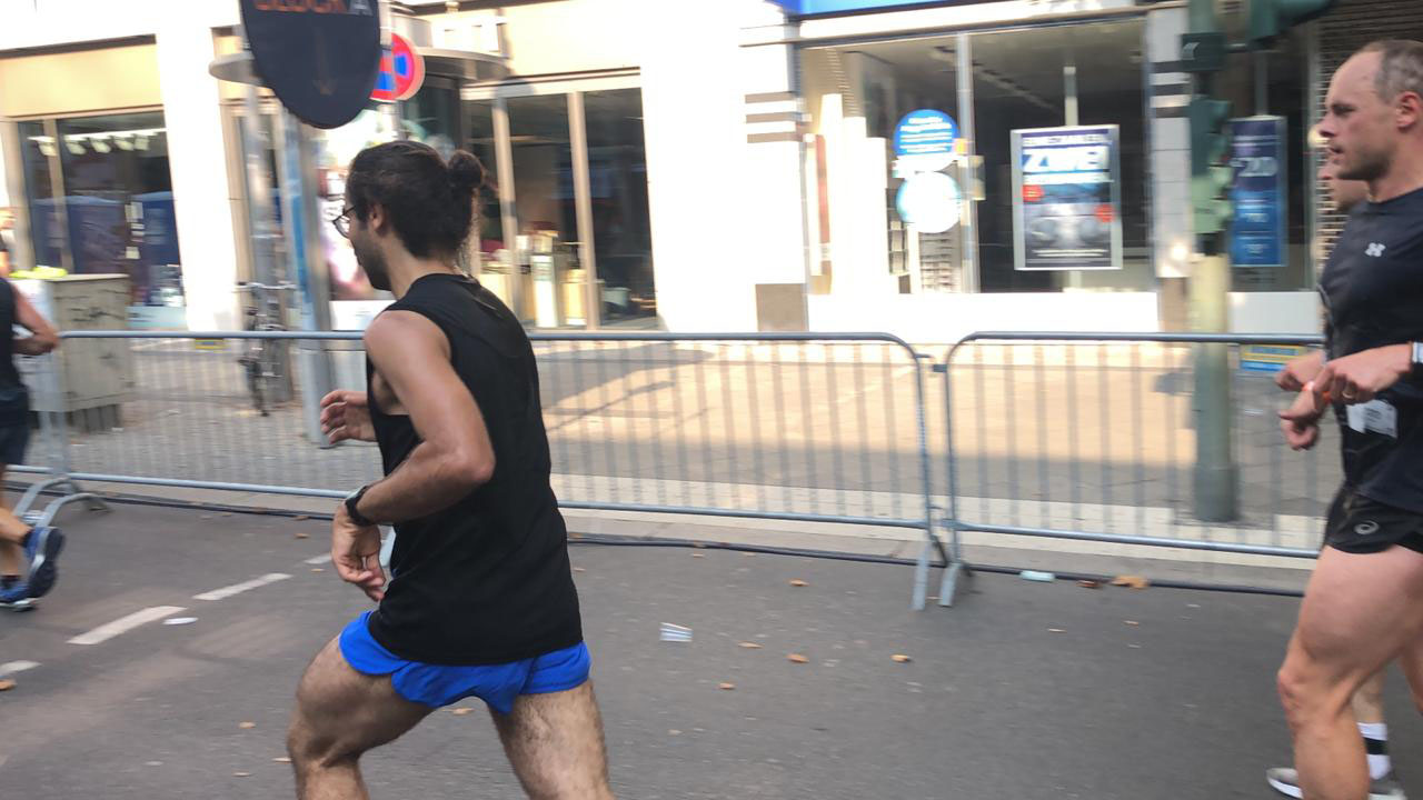 Ali trains his body to run, and thinks of the muscles that build up in this process. The thigh muscle is the largest in the human body, and its size and its build up through its function interest Ali and inspire his work. There is often a leg extended on its own, on the ground, in Ali’s works, to reference fatigue.