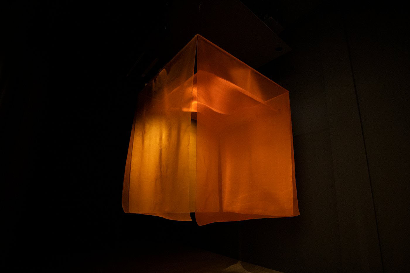 The heart as an organ is here a metaphor for the throbbing of this physical body, undergoing change, assimilating, becoming sentient but also becoming other. “Happens to the Heart” (2022), a microprocessor-controlled sound installation by Turkish artist Hale, invites us to experience the living heart, invading the host and becoming alive in the process. The work is a structure floating up and down, composed of loose orange silk fabrics forming a cube, creating a vacuum effect, as if we were in the presence of this new heart, nestling in the rib cage, and the person is breathing out a sigh of relief at the improbable but amazing continuity of life. The rhythmic sound of the motor pulling up the silk pieces inside of the airy cube takes the place of a life support machine, animating the heart, transforming dead tissue into a living organism. Is this a miracle? In fact we’re dealing with very secular wonders, for as Nancy tells us, the wish for survival and immorality is an element in modernity’s program of mastery over nature.