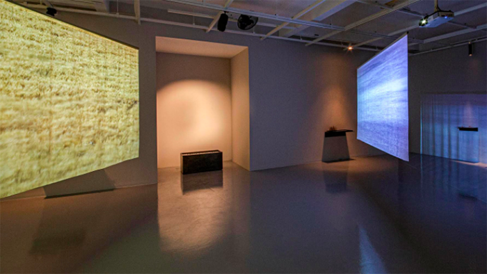 In her recent work, such as “Where the Winds Rest” (2019), inspired this time by Turkish poet Edip Cansever, Tenger deals with surfaces of history that at first seem ordinary, innocuous and neutral as images, but that soon become latent, and reveal dangers lurking underneath, unexpected threats and risks, unknown layers in a fragmented narrative. Similarly in the current exhibition, the installation stands not only for the diastole and systole of the heart, but also for the way in which modern life unfolds: The narratives of civilization are artificially sustained in a world that is both chaotic and violent, and always in constant motion and change. The invisible cube of the heart, both organ and container, formed by the emptiness around the floating silk, blurs the distinction between inside and outside, in our history, in our personal lives, in the physical borders of politics and reality, and in our bodily existence. This constant loop of ups and downs is nothing like an extraordinary event—it is just bare life itself.