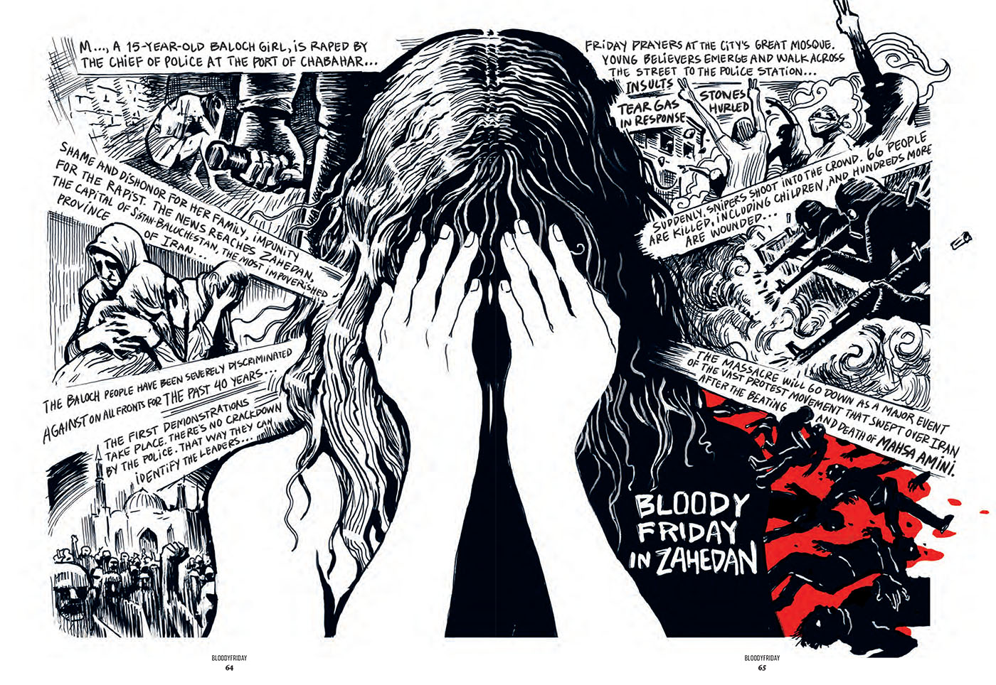 The choice to engage both these audiences simultaneously illustrates the book’s ambitions and its operating philosophy. The story of the Woman, Life, Freedom movement, or Jin, Jyan, Azadî in its Kurdish origins, cannot be told with only one voice or toward only a single conclusion. Satrapi, who notably distanced herself from comics following the success of Persepolis (2000–2003), Embroideries (2003), and Chicken with Plums (2004), contributes to this anthology a preface, an introductory essay, a two-page spread on the Islamic Revolutionary Guard Corps, and participation in the volume’s final comic “And Then?” The rest of the book is indebted to a multigenerational collective of writers, scholars, and artists with varied experiences inside and outside of Iran.