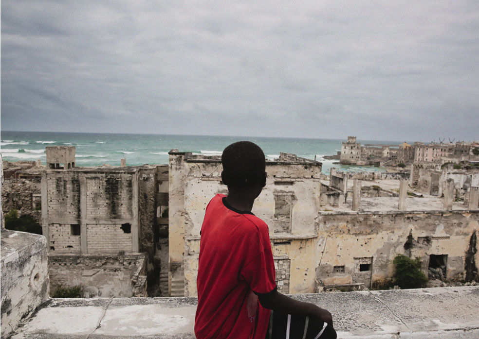 “Inside Mogadishu Cathedral,” by Hana Mire shows the beauty of the city’s ruined past and an element of its Christian heritage, which is juxtaposed by “The wind” a powerful image of a woman’s mustard-colored burqa fanning out in the street. Photographer Firdawsa Hussein’s “Through My Sister’s Eyes” is a portrait of a young Somali girl’s own creative mind. The artist recalls, “I asked a girl to express her emotions to me by doing whatever she wanted…That is why it is my favorite photograph.” Similarly, her powerful photograph “Nomad,” offers a glimpse into the traditional nomadic lifestyles of the past and seems to question how the young nomad’s life will be shaped in the future.