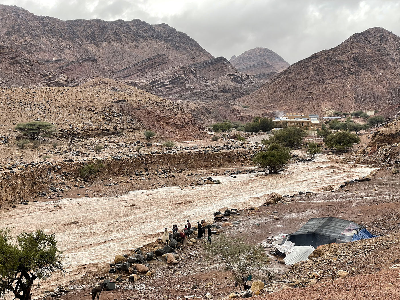 And yet…we were moved by this miracle deluge for the water it brings. “Your faces have brought us this baraka,” this blessing, several ecolodge staff members exclaimed, when we greeted them. In the hours that followed, they shared real-time news and videos of the river’s activity. As in all exceptional happenings, everyone talks to everyone else and connections are forged between strangers who, on the face of it, may have little in common. We ventured out from the lodge a few hours later for a sunset walk through the mountains, tinged with wine, pistachio, and charcoal hues. And we witnessed a second miraculous event: the river had disappeared with no trace. It was not simply absorbed by the earth, but it rushed away. (Indeed, we now could believe that Moses literally parted the waters at God’s command: “Stretch out thine hand over the sea and divide it.”)