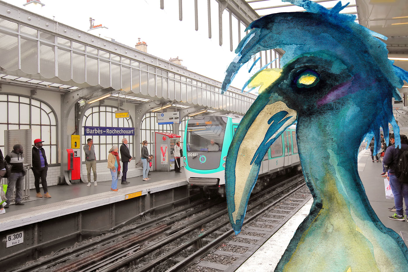 When I crossed to the other side of Paris the next morning, I ran errands and met friends, and then took train number 4 northwards. I planned on getting off at Château Rouge to walk in Barbès and the Goutte d’Or. I recalled Chirac’s infamous remark when he visited these neighborhoods, “le bruit et l’odeur” (the noise and the smell), which the band Zebda, several of whose members are of North African origin, used as the title of their 1993 album.  Barbès is famous as a stronghold of the Algerian resistance during the Algerian war of liberation (1954-1962) and a theatre of police repression. I had been instructed by my friend (and TMR writer) Melissa Chemam to see an exhibit by Franco-Algerian artist Katia Kameli at the Institut des Cultures l’Islam in this neighborhood. I had noticed it advertised in the city in the form of a poster of a preposterous, beautiful bird painted in purplish-blue watercolors.