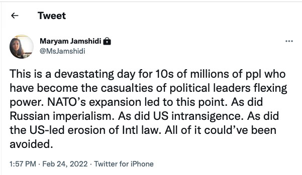 Maryam Jamshidi, an international law professor at the University of Florida Levin College of Law, writes on Twitter: “This is a devastating day for 10s of millions of ppl who have become the casualties of political leaders flexing power. NATO’s expansion led to this point. As did Russian imperialism. As did US intransigence. As did the US-led erosion of Intl law. All of it could’ve been avoided.”
