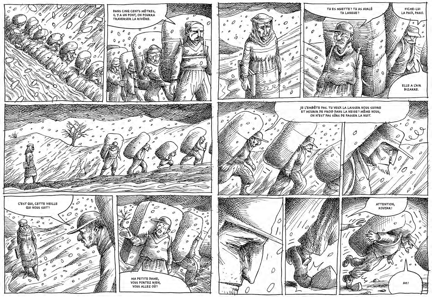 Mana Neyestani: In the past two decades, there has been a lot of news about kolbars, along with impressive images and clips — news about kolbars being shot by the regime’s agents; or being killed by avalanches, floods, freezing conditions, and other disasters; reports about the hardships of their job; their social and financial situation. However, no positive change has occurred in their situation. I worked on some editorial cartoons about the kolbars based on these news and events. Almost five years ago, I decided to make kolbars the subject of a graphic novel; it would both bring them into the spotlight and provide dynamic and attractive material for illustration. I based it on many pictures and clips that I had seen, including the story of two teenage kolbars who were frozen to death a few years ago, as well as an interesting video report made by BBC Persian reporters about kolbars. At the same time, I contacted one or two Kurdish kolbars who were in social media, such as Instagram, and asked them questions. Not only about the trip itself, but about their lifestyle and daily routine, to understand them better. Then I started to imagine the moments and scenes that I would like to see in my book, including the concept of “load” becoming a villain and a monster with whom the old kolbar is wrestling with — just like a mythical battle. Then slowly I shaped and made the story.