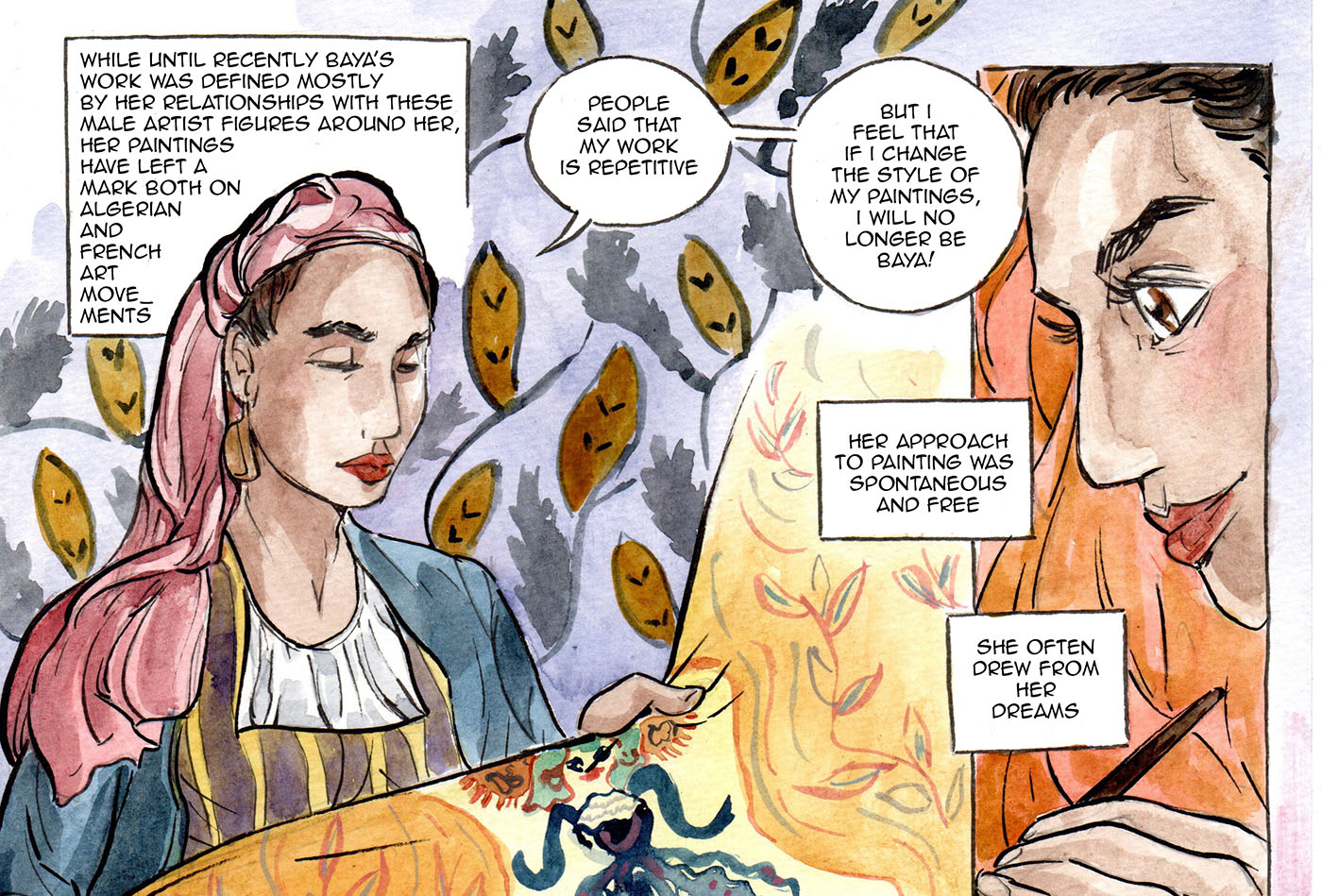 Baya was among the first Algerian artists to be recognized by the art world in Paris. Though considered naïve in style, her work endures.