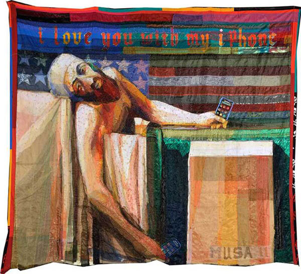 Painting 1 “I Laugh You with my Ford” assembled fabrics, 258x244cm (2011); 2 “I Love You with My iPhone” assembled fabrics, 290x255cm (2011); 3 “I Love You with My AK47” oil on assembled fabrics on wood, 121x90cm (2019)