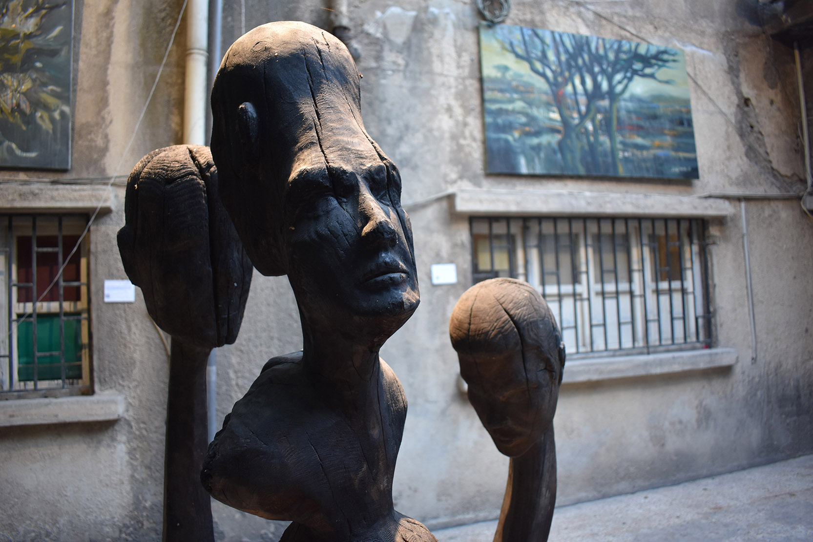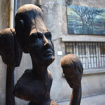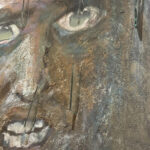 In “Sulphur,” Rabee Khalil sculpts a tortured metamorphosis: human heads blooming like mutations from a single spine of charred flesh. The material, dark and cracked like burnt wood or dried blood, evokes something chemical and ancient, as though the body had ignited from within. There’s no clear beginning or end, only eruption. The faces, half-formed and overgrown, seem to argue with one another — conflicted selves battling for coherence, memory, or release. Like sulphur, each head lingers in the air: heavy, elemental, and impossible to ignore.